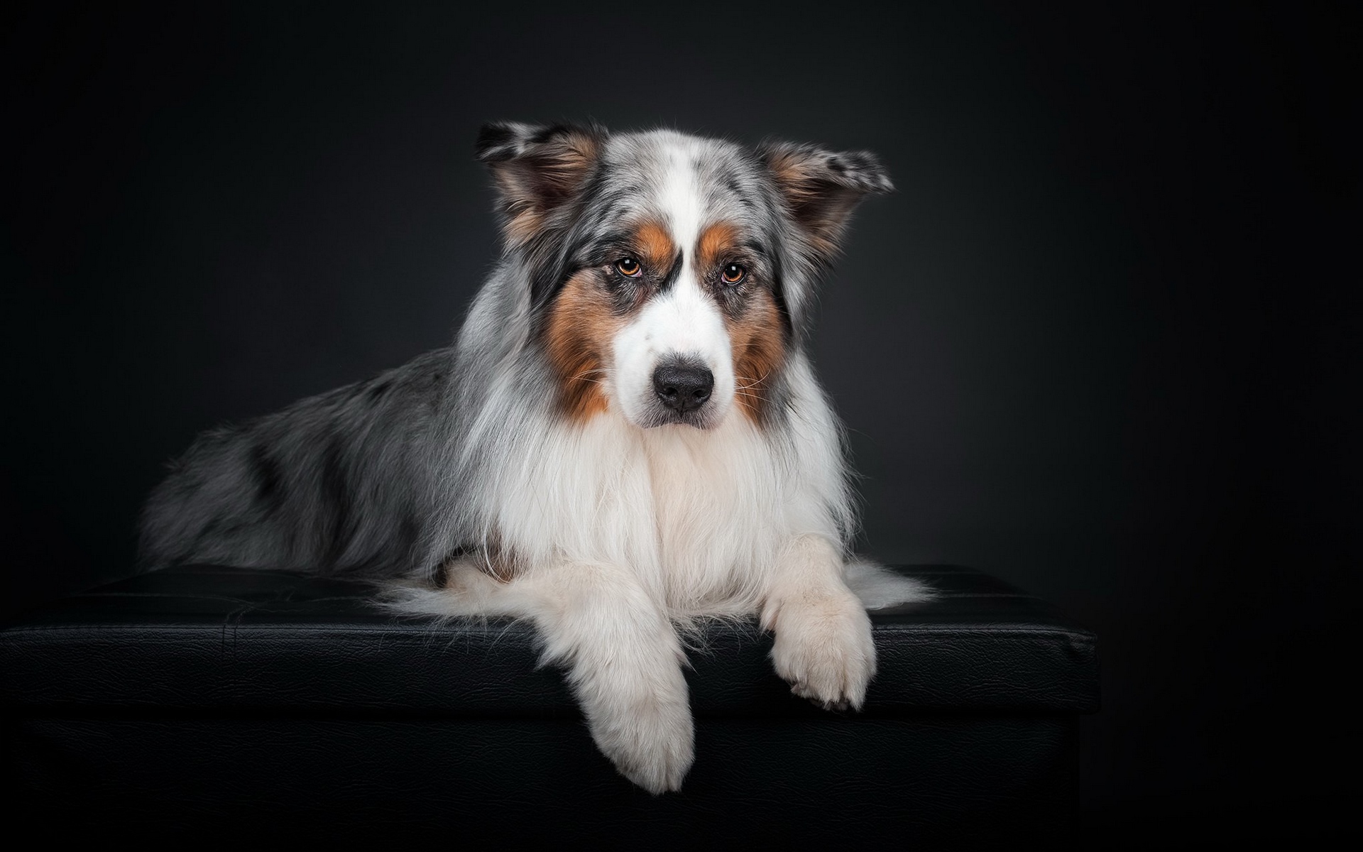 Description: A dog is laying down on a black surface with a black background and a black background behind it is a black background.