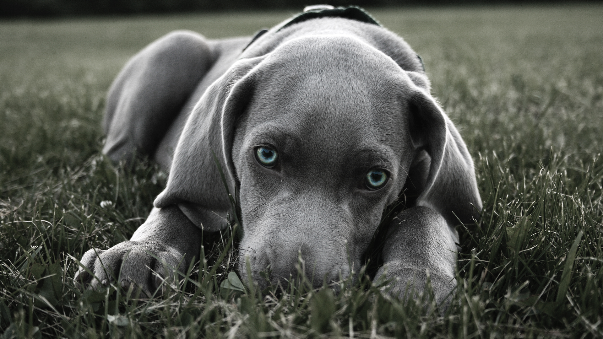 Description: A dog laying in the grass with its head on the ground with its eyes open and a leash on its neck.