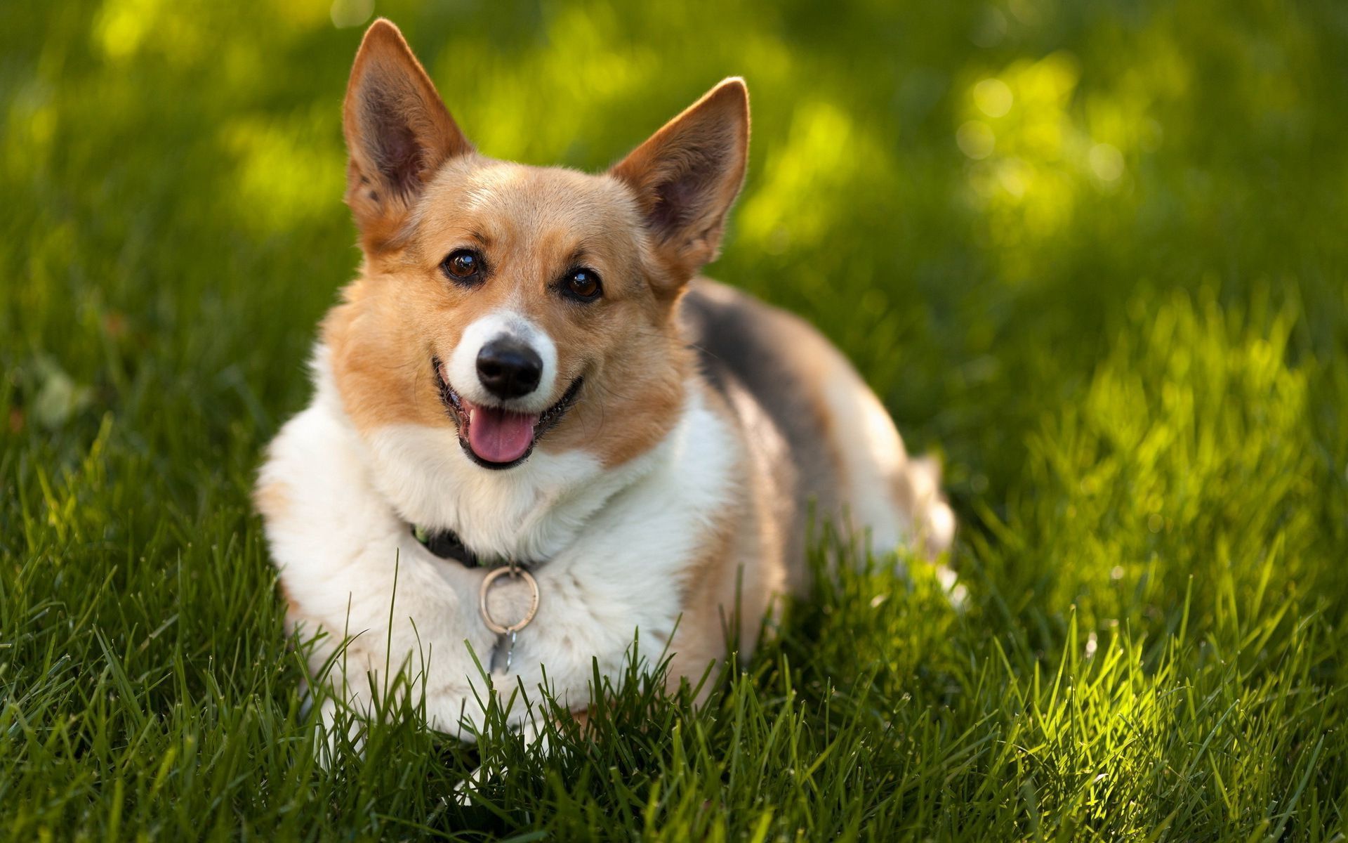 Description: A dog laying in the grass with its tongue out and eyes open.