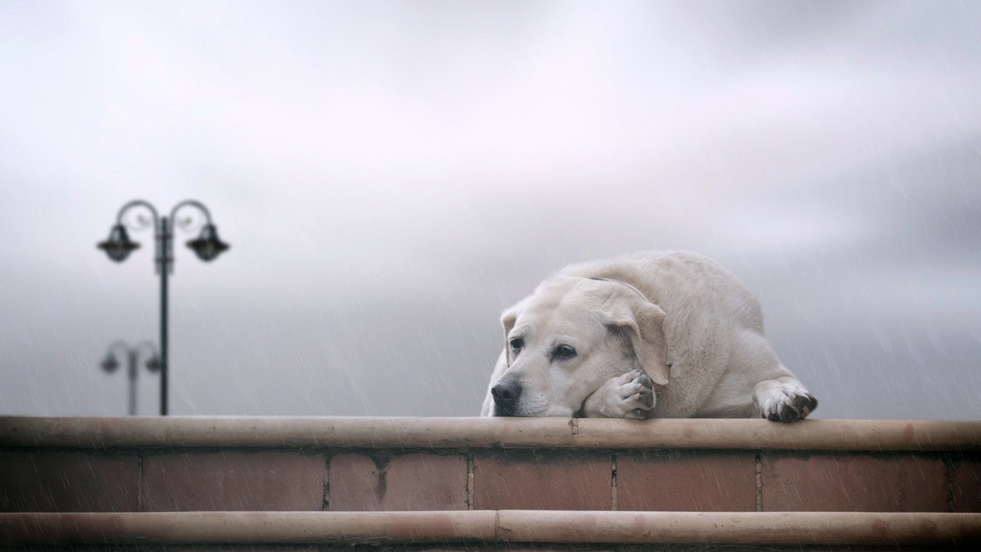 Description: A dog laying on a ledge in the rain with its head on the ground and his paw on the ground.