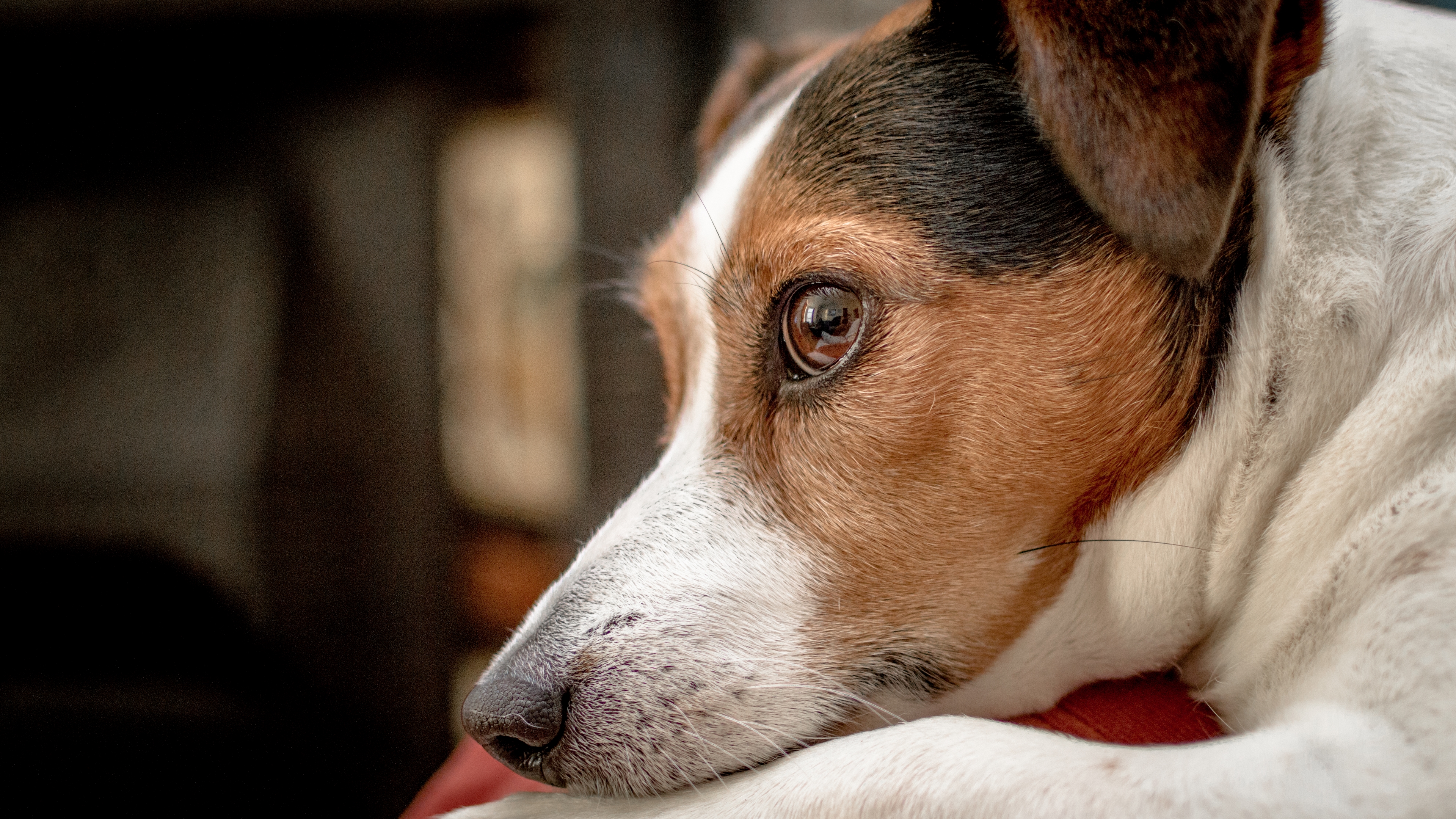 Description: A dog is laying down on a red blanket looking at something in the distance with his head resting on his paws.