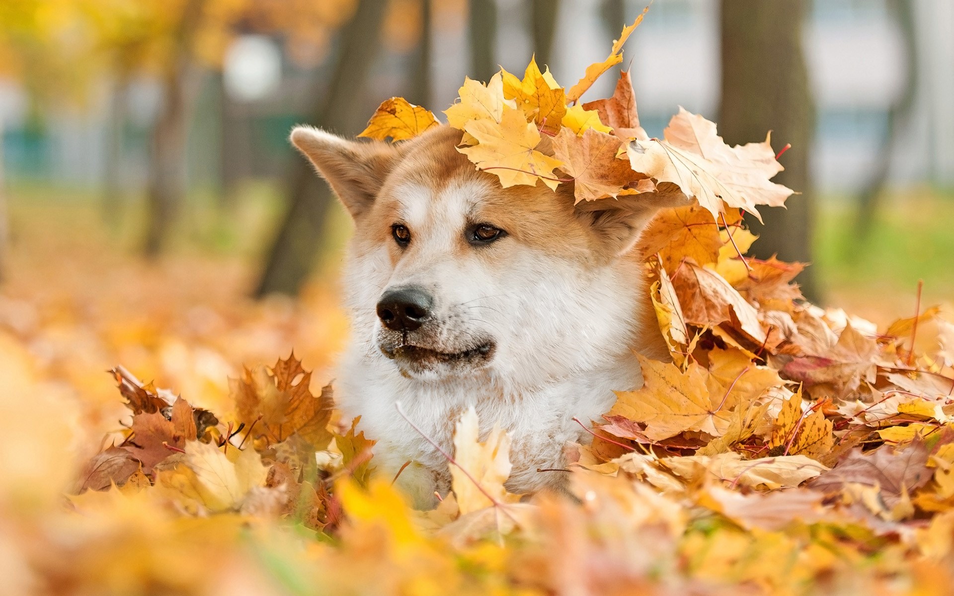 Description: A dog with a leaf crown on its head in a field of leaves in autumn time.