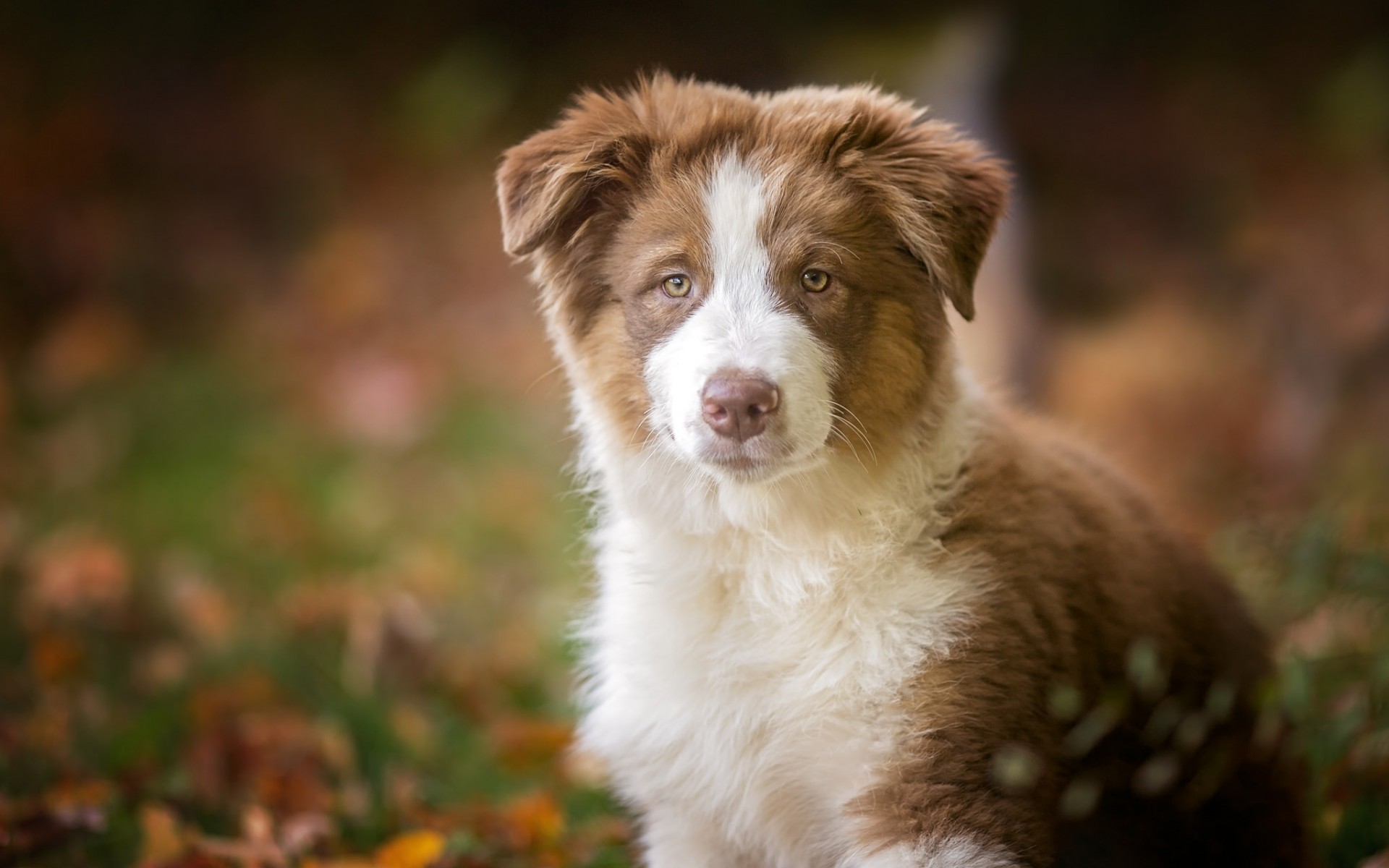 Description: A brown and white dog sitting in a field of leaves and grass with a blurry background of grass and leaves.