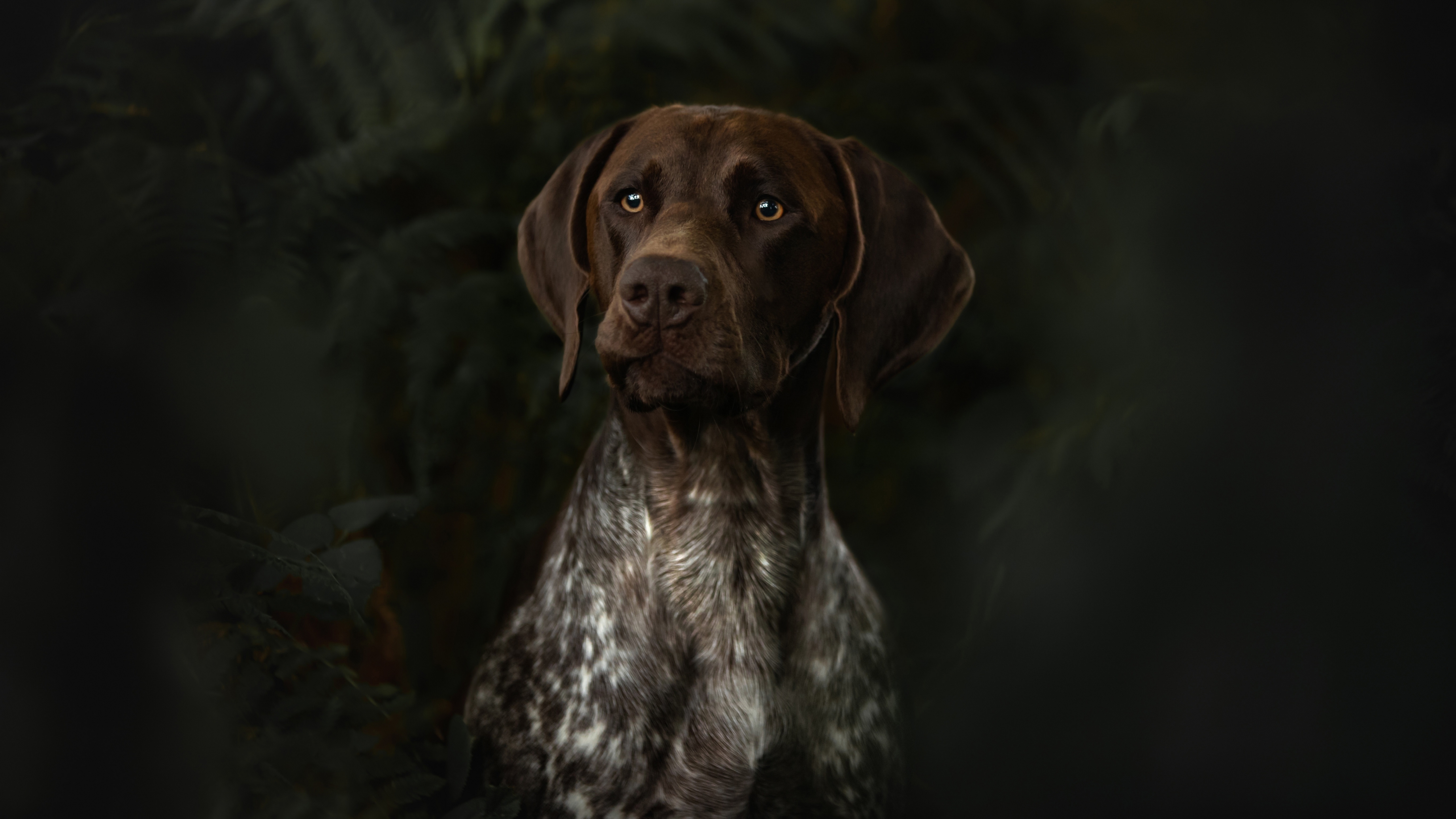Description: A dog is sitting in front of a dark background with leaves and plants in the foreground and a black background with a white spot.