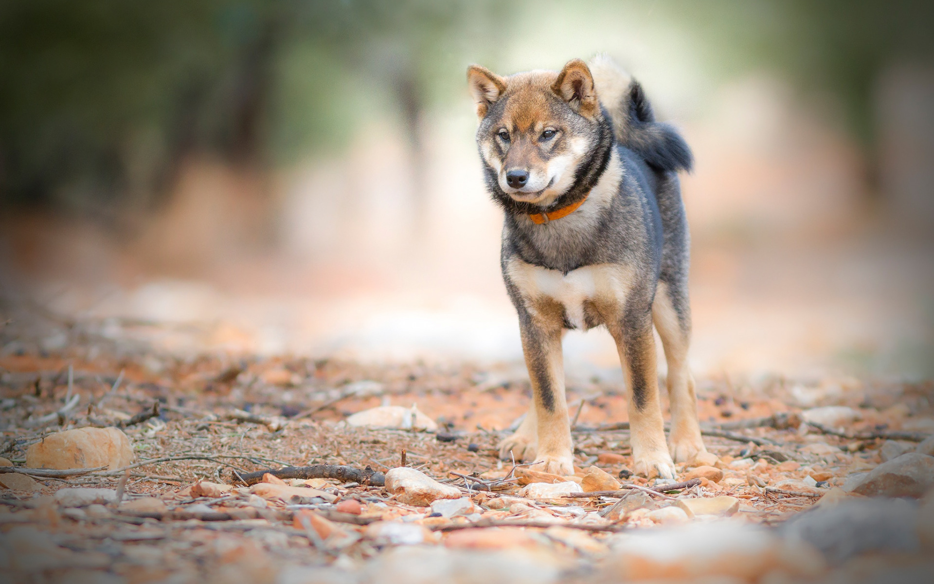 Description: A dog standing on a leaf covered ground in the woods with a collar on it's neck and a collared collar on.