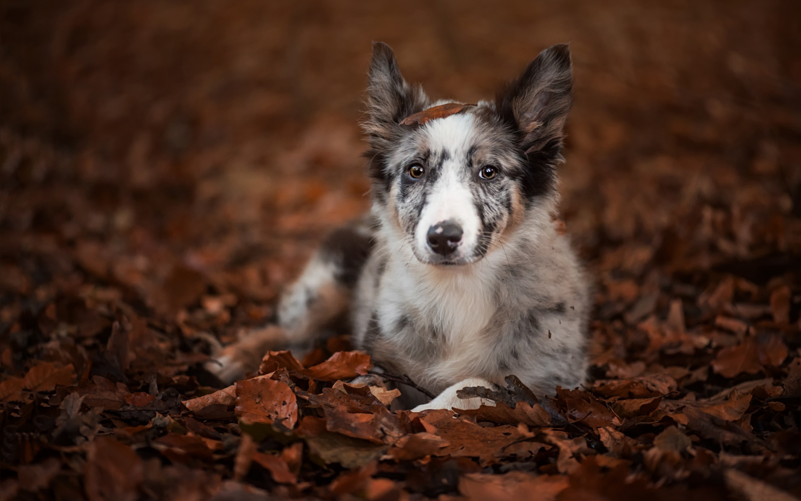 Description: A dog laying on top of leaves in the woods with a sad look on his face and eyes.