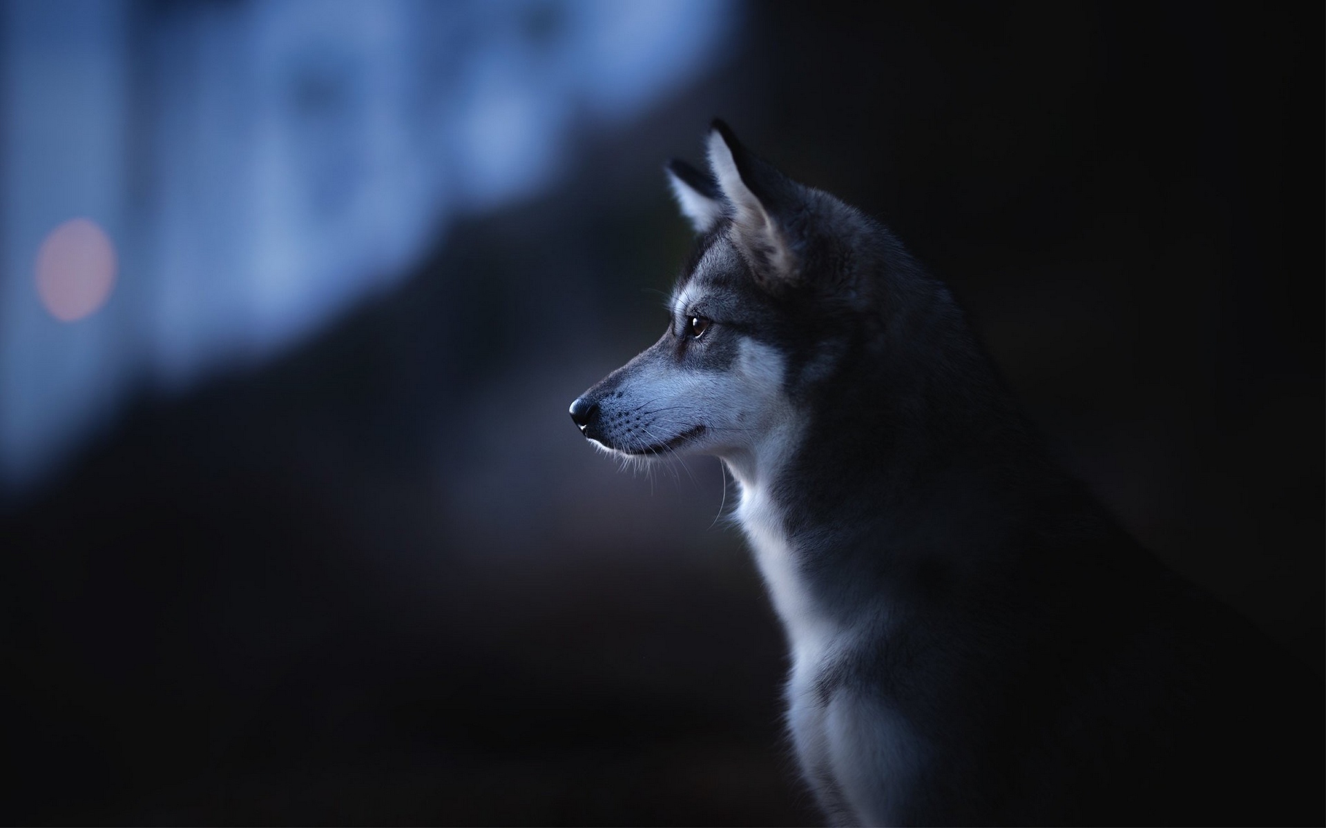 Description: A dog is looking at something in the dark with a blurry background of the image of a dog.