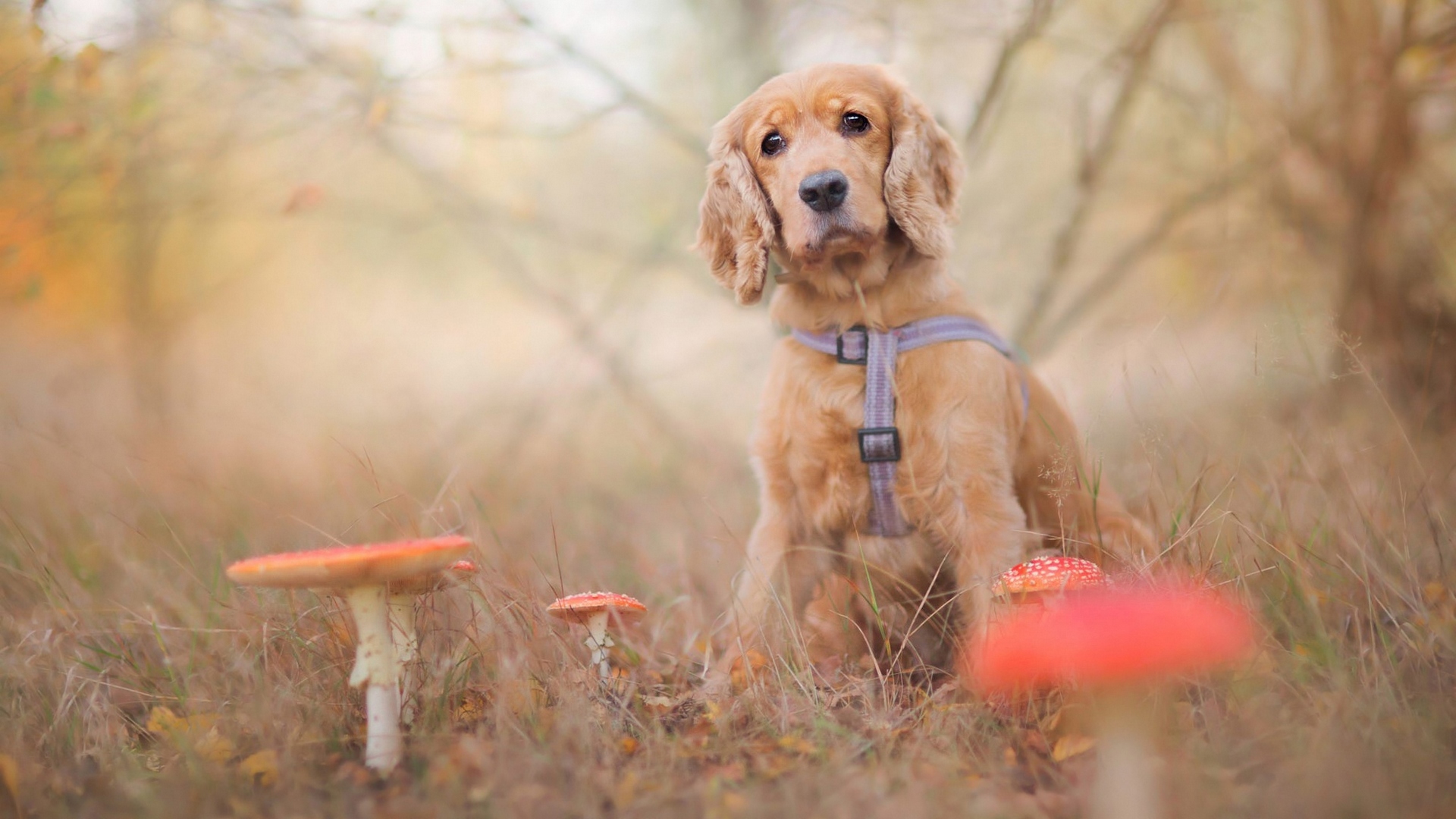 Description: A dog is sitting in the grass near mushrooms and mushrooms in the woods.