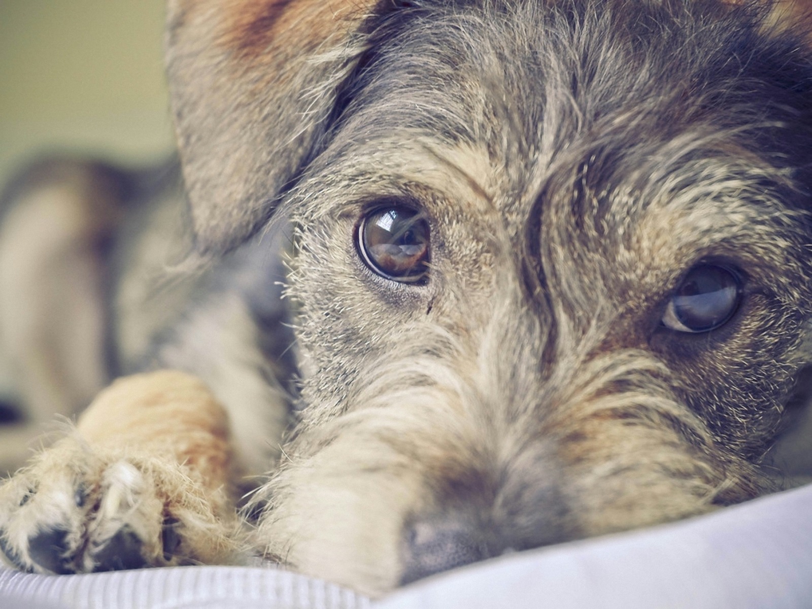 Description: A dog laying on a bed with his paw on the pillow looking at the camera with a sad look on his face.