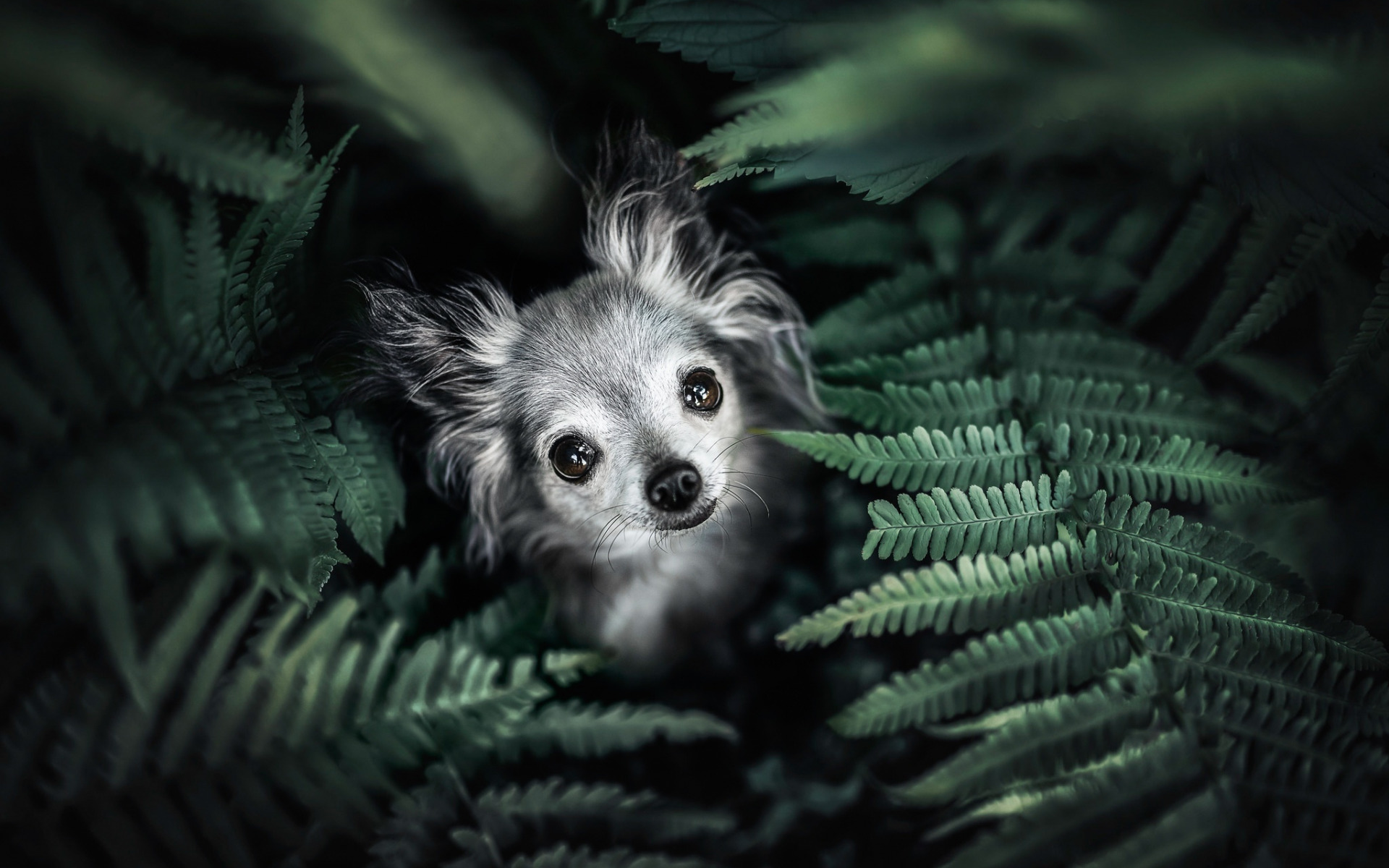 Description: A dog peeking out from behind a fern leaf filled forest of green leaves.