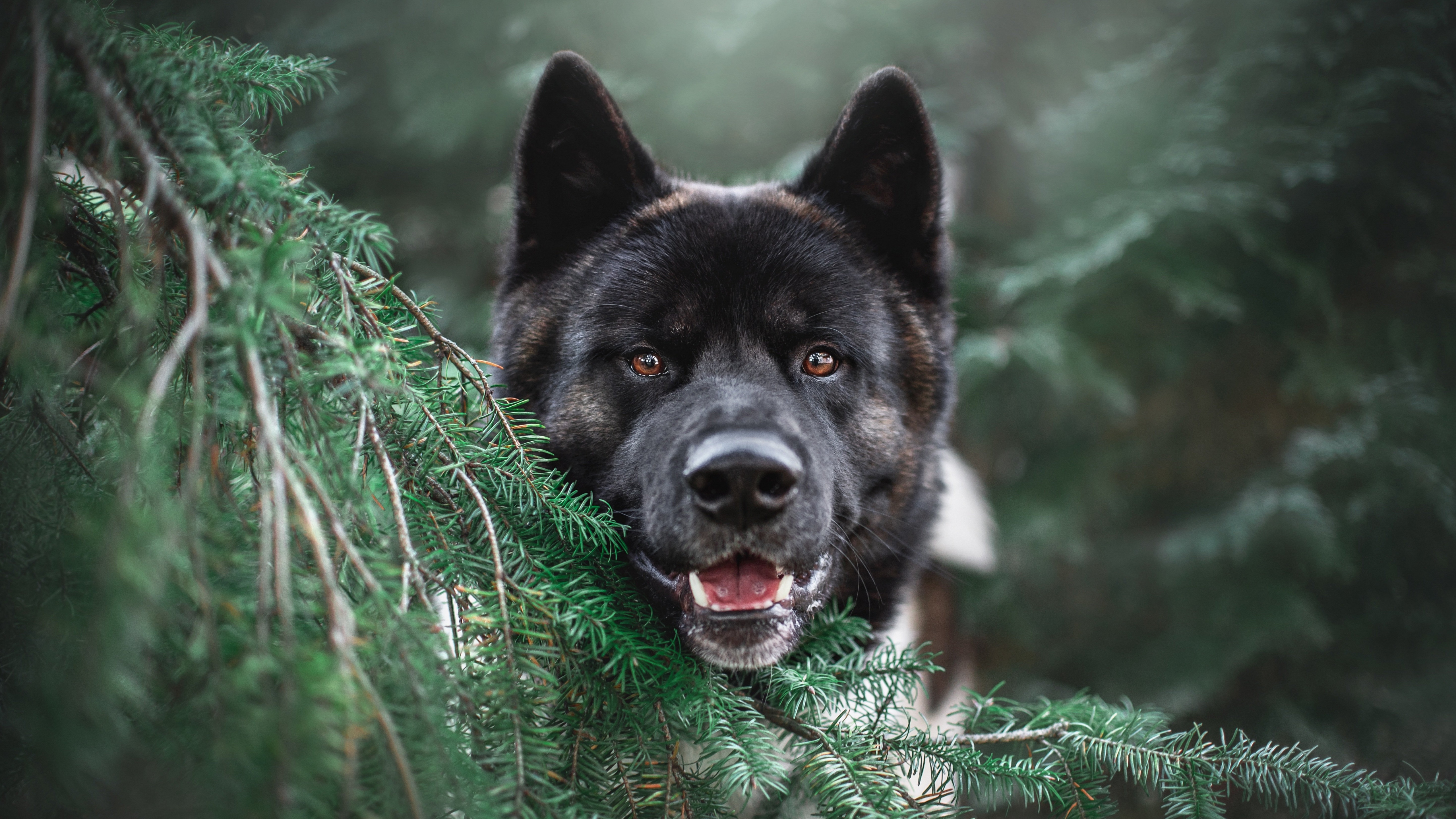 Description: A dog is peeking out from behind a tree branch with its mouth open and tongue out.