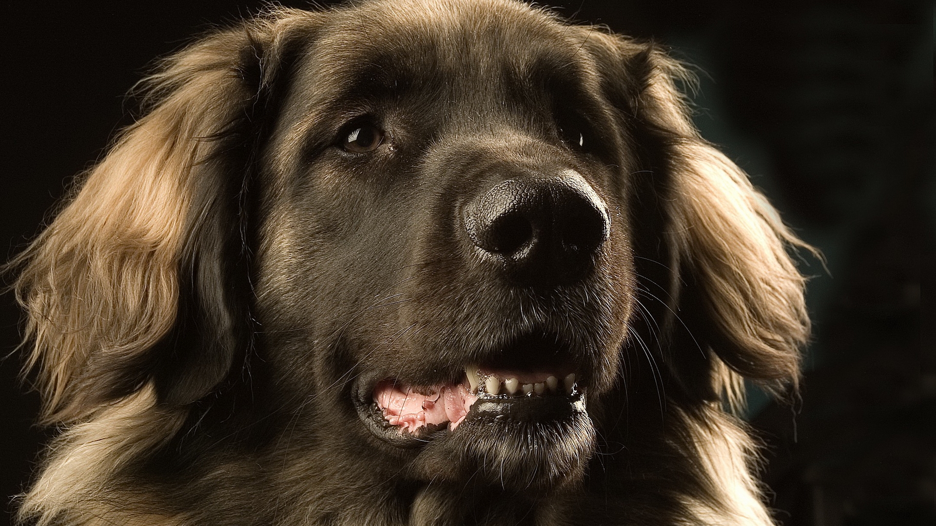 Description: A close up of a dog with a black background and a black background with a white border around it.