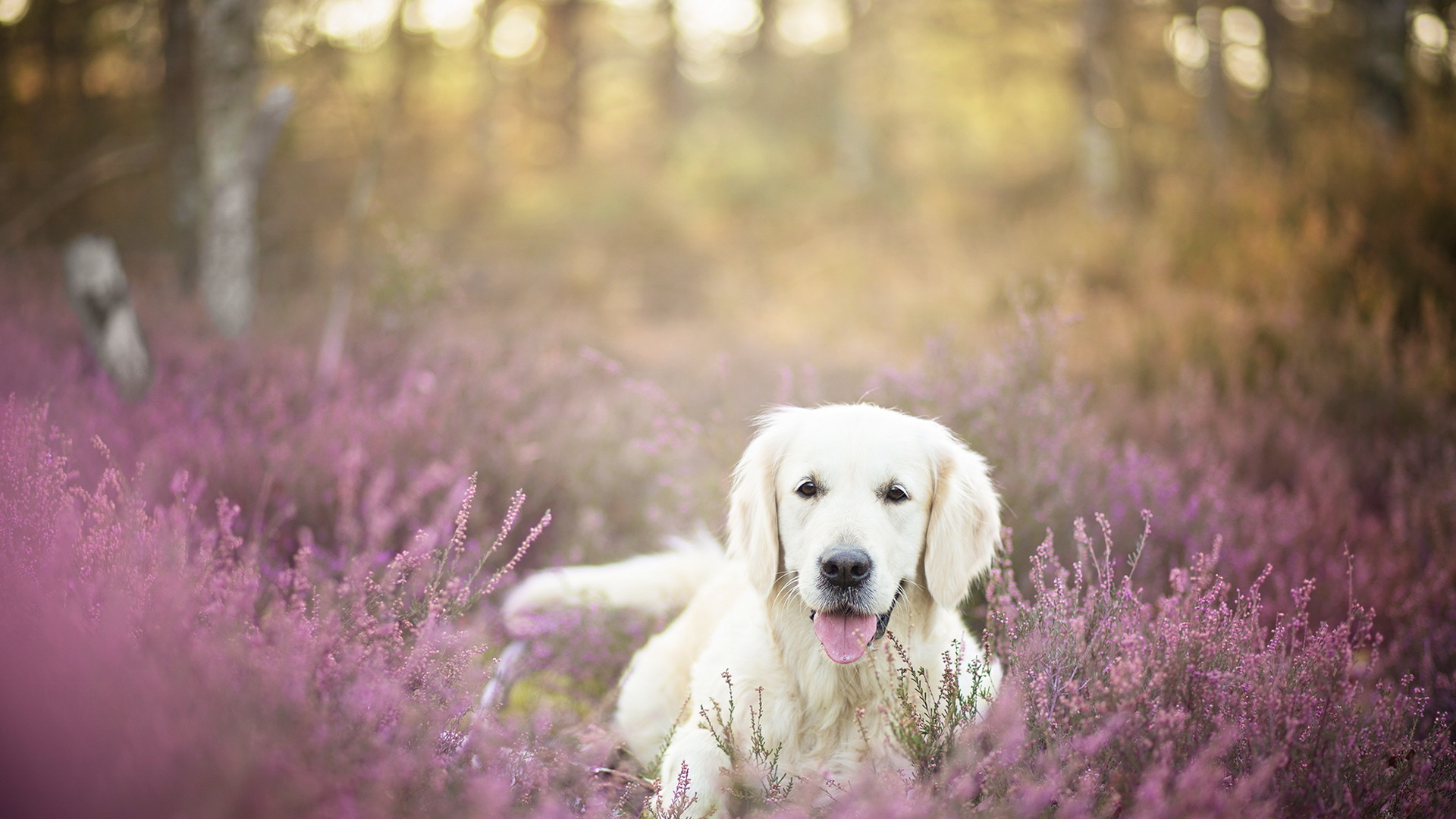 Description: A dog laying in a field of purple flowers with his tongue out and tongue out.