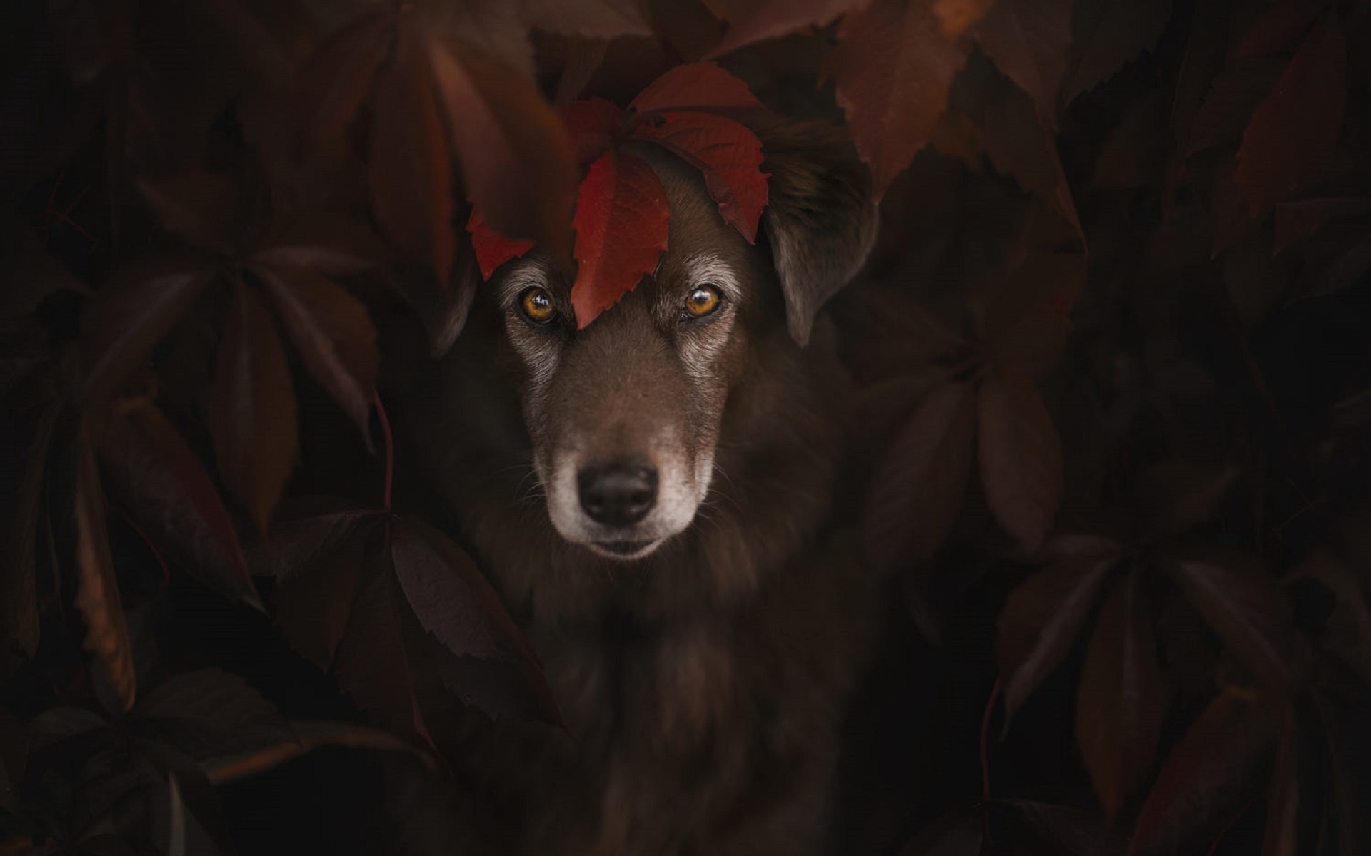 Description: A dog with a red hat on its head looking out from behind some leaves in the dark.