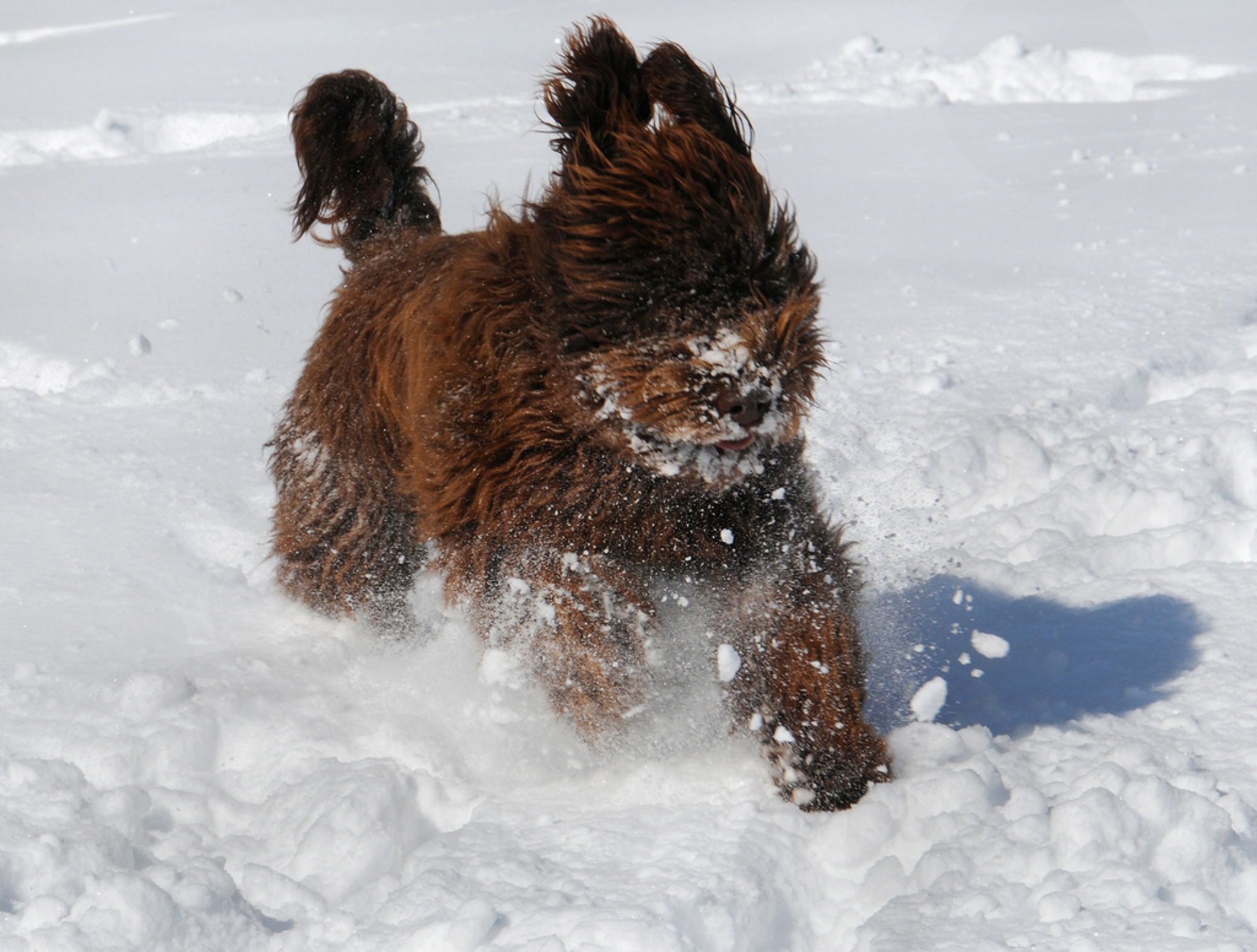 Description: A dog running through the snow in the snow with its mouth open and tongue out.