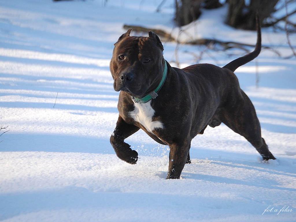Description: A dog running through the snow in the woods with a green collar on it's neck and a green collar on its neck.