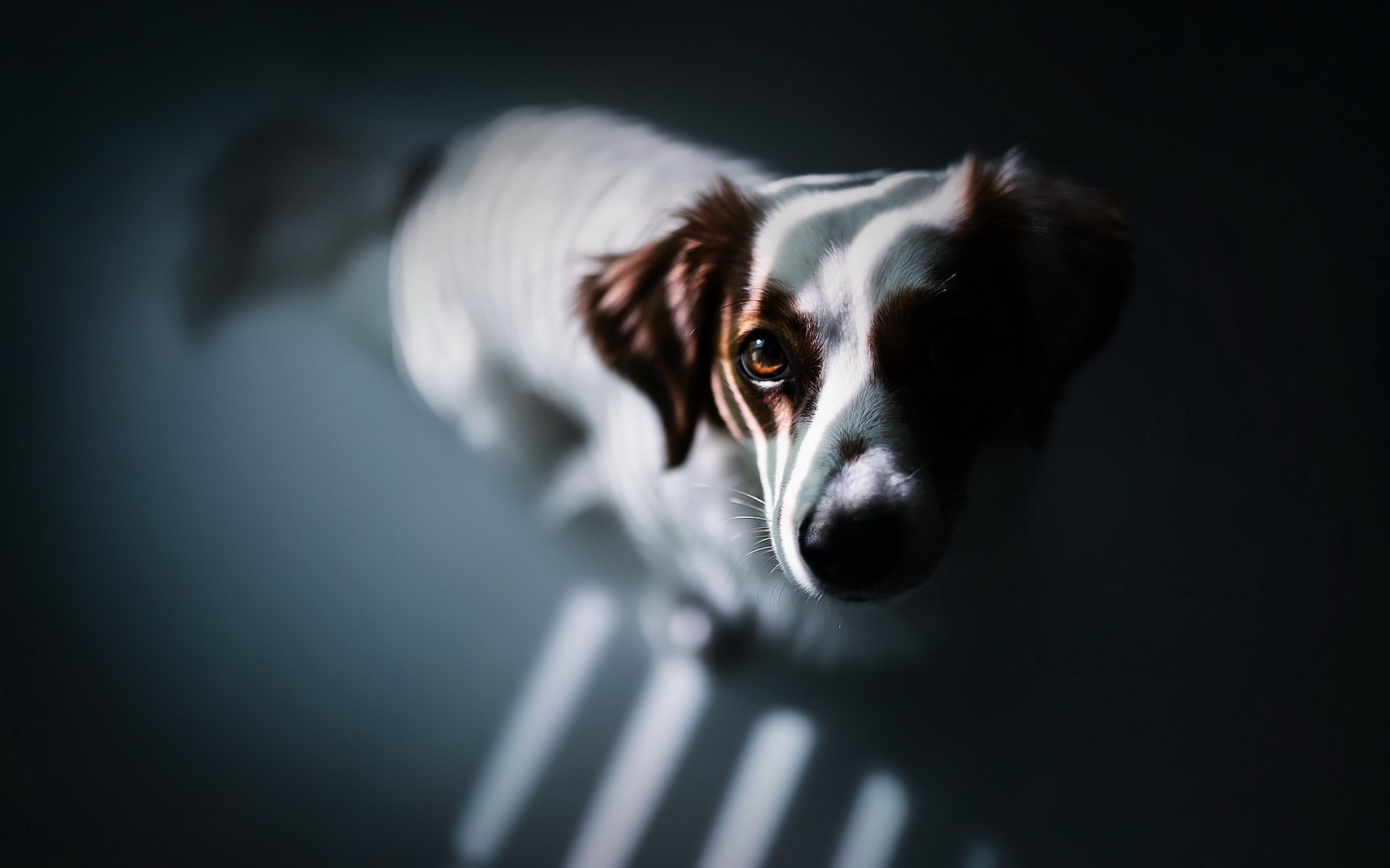 Description: A dog is standing on a chair looking at the camera with a sad look on its face and head.