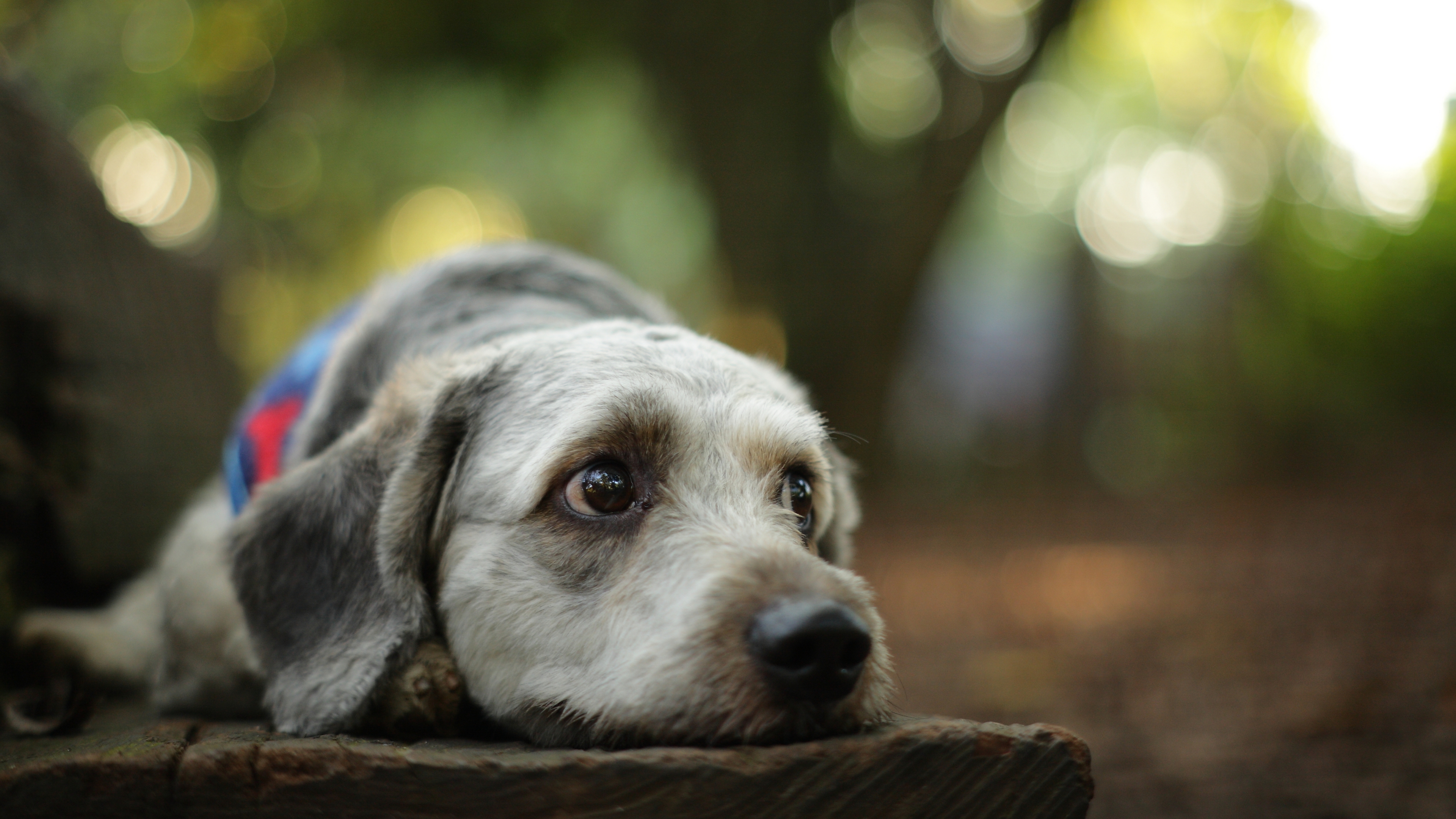 Description: A dog laying on a wooden bench in the woods with a blue and red collar on it's head.