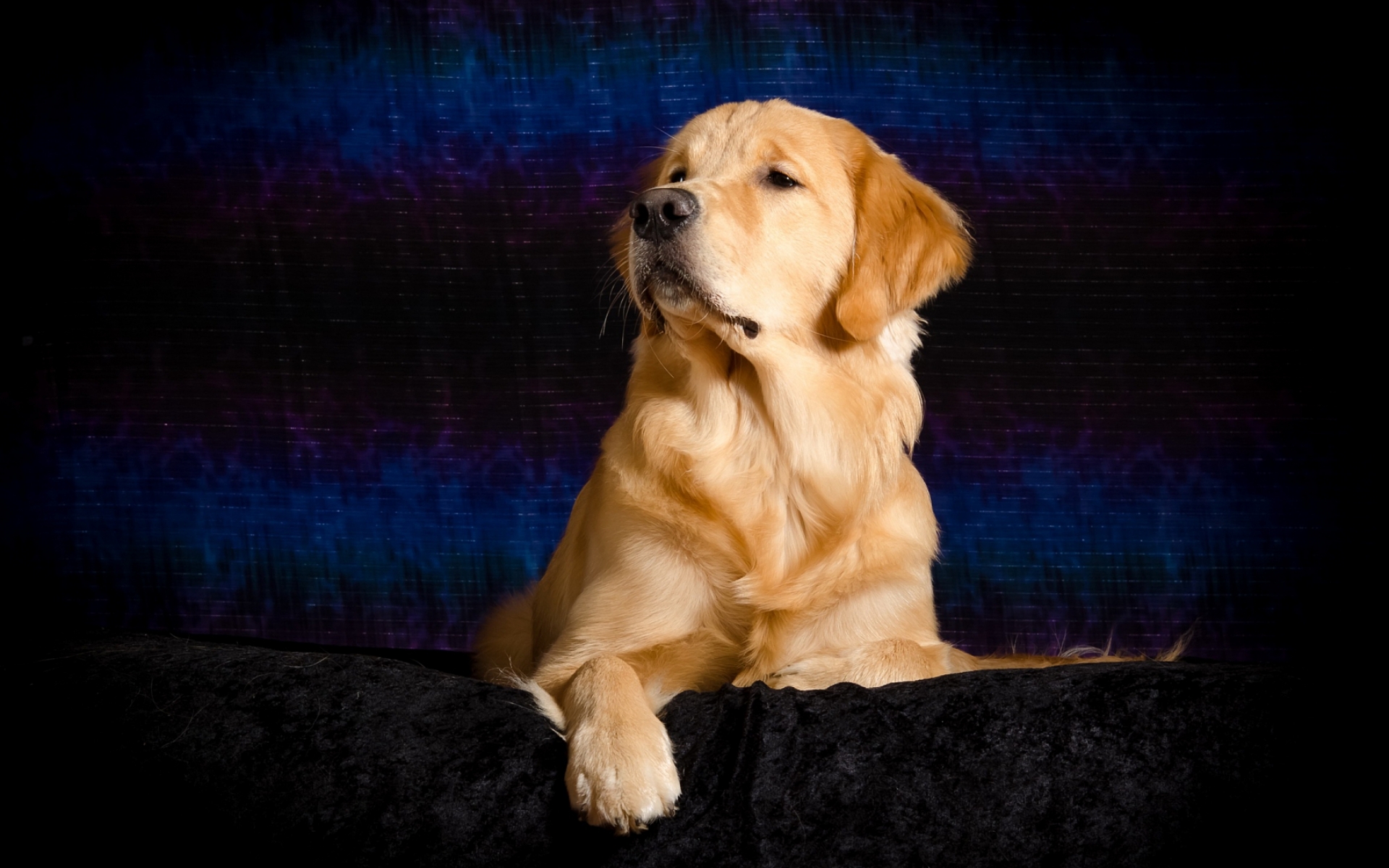 Description: A dog is sitting on a black blanket and looking up at something in the air with his eyes closed.