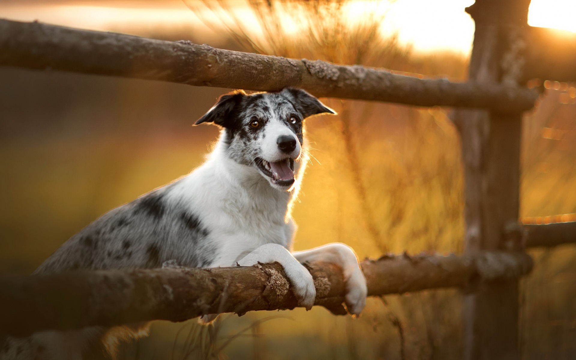 Description: A dog is sitting on a fence looking at the camera with a smile on his face and his paw on the fence.