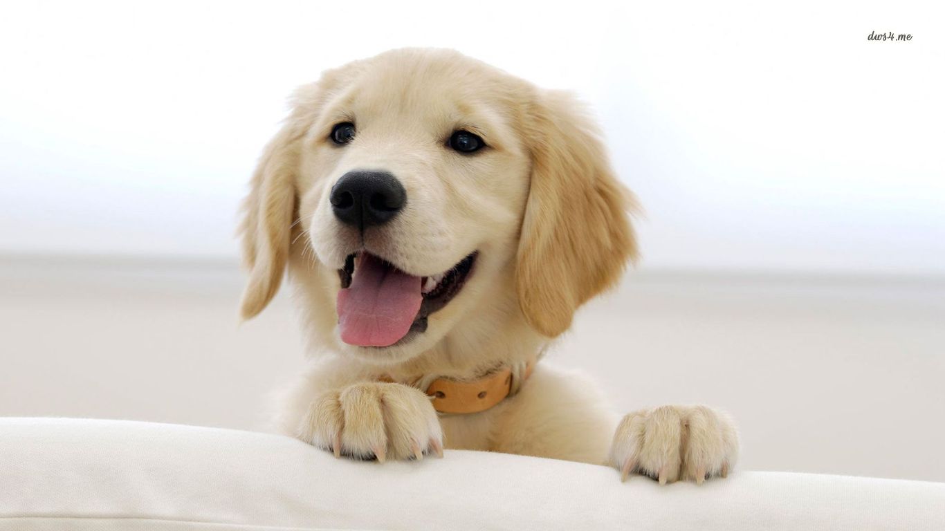 Description: A dog is sitting on a pillow with his paws on the pillow and looking at the camera with a smile.