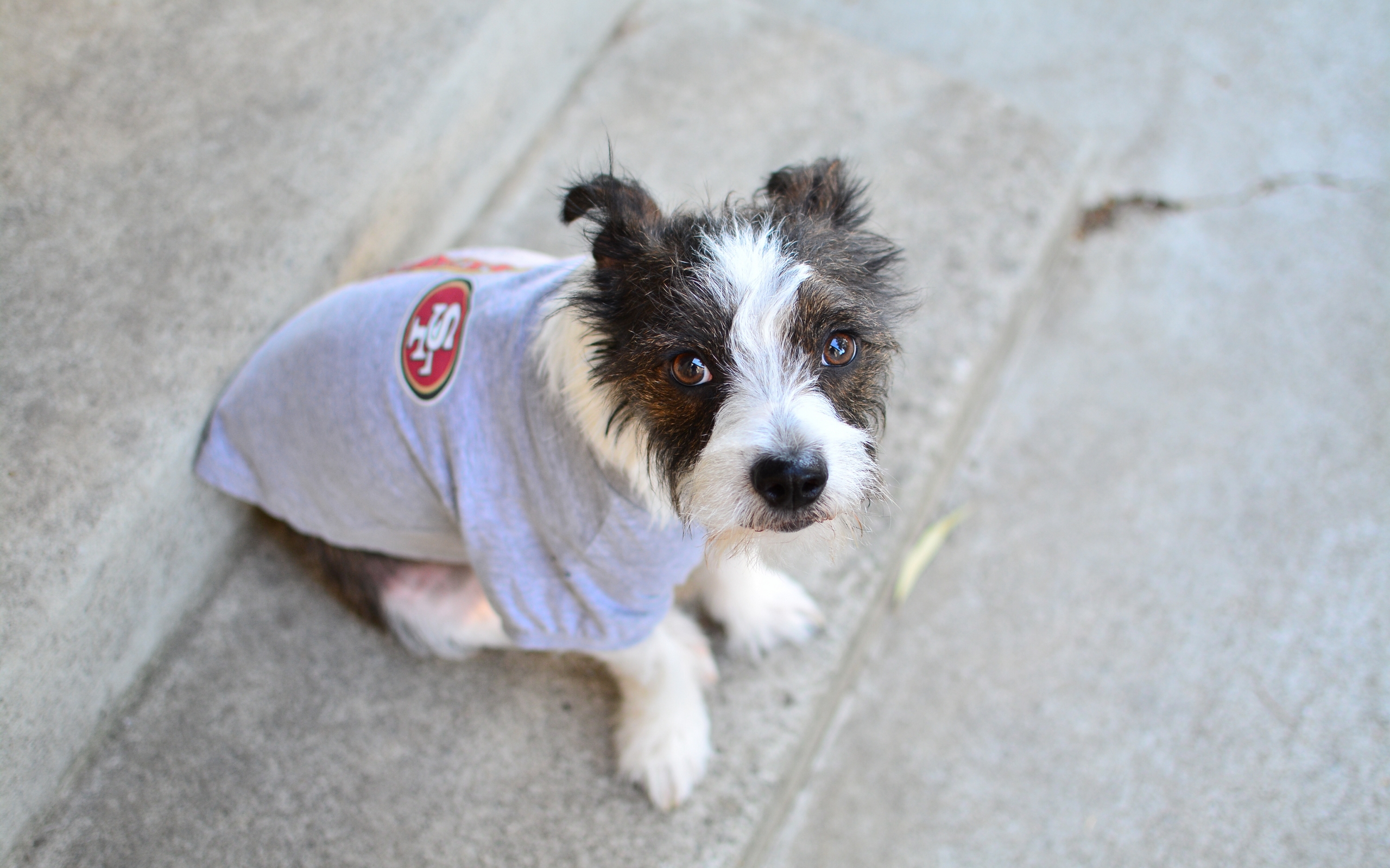 Description: A dog wearing a shirt sitting on the sidewalk looking up at the camera with a sad look on his face.
