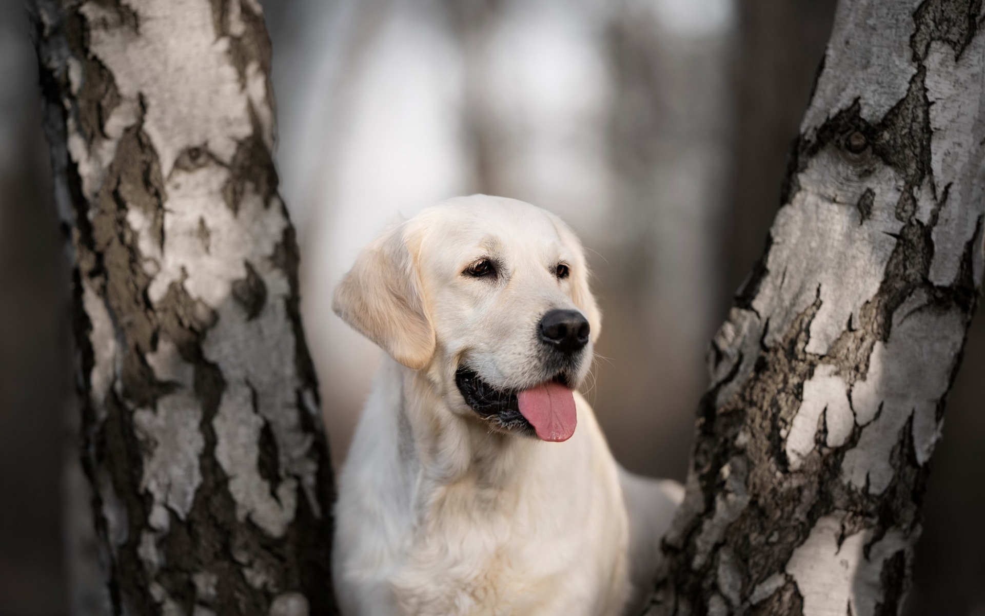 Description: A dog is sitting in a tree with its tongue out and tongue out.