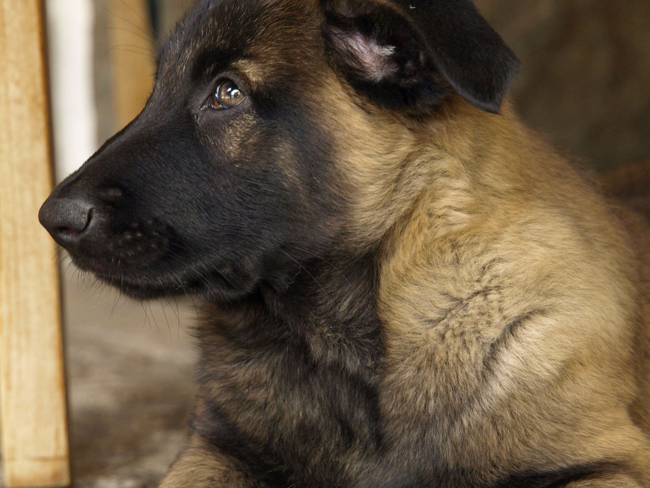 Description: A dog is sitting next to a wooden post and looking off into the distance with a sad look on his face.
