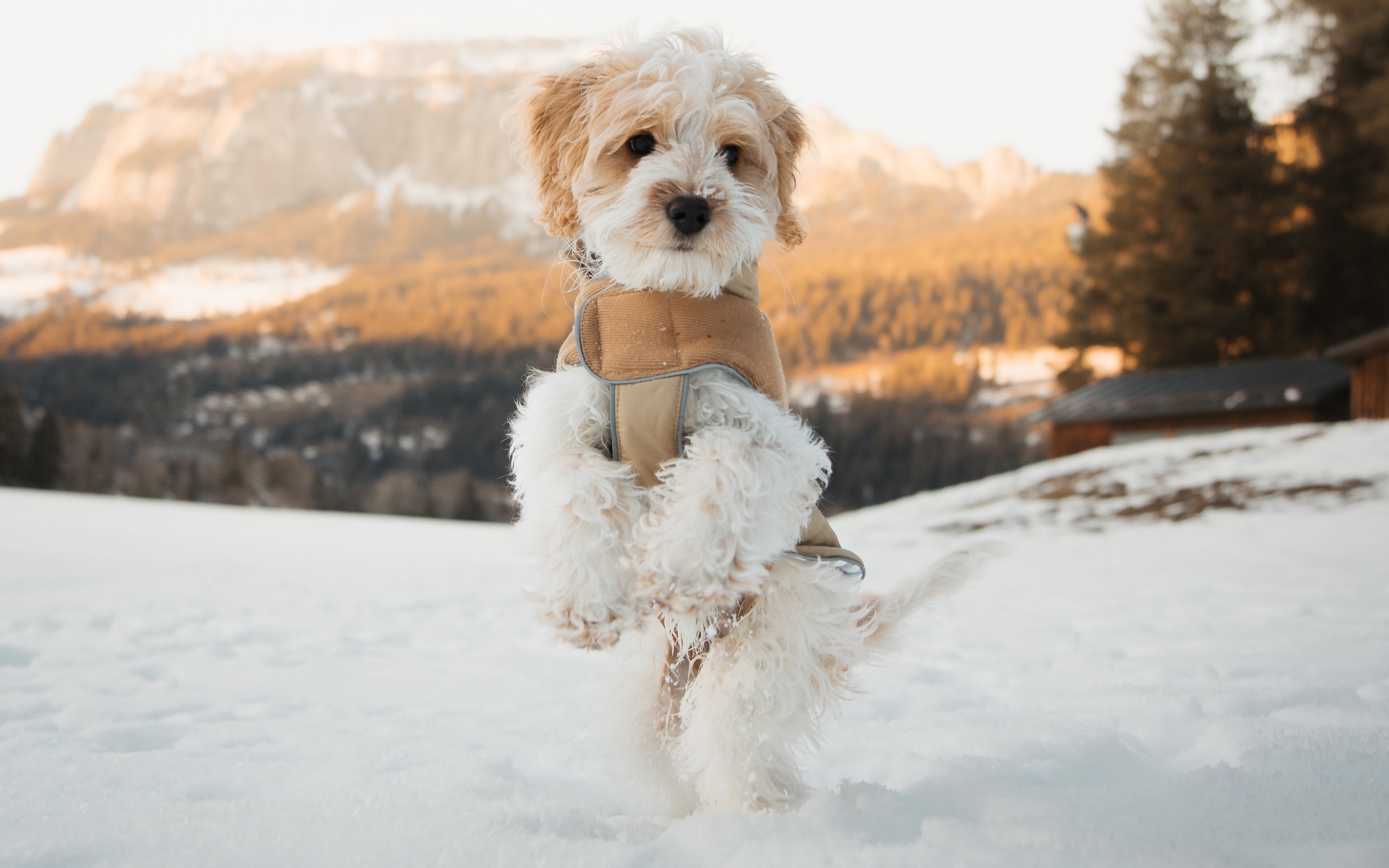 Description: A dog is wearing a harness in the snow with mountains in the background in the background.