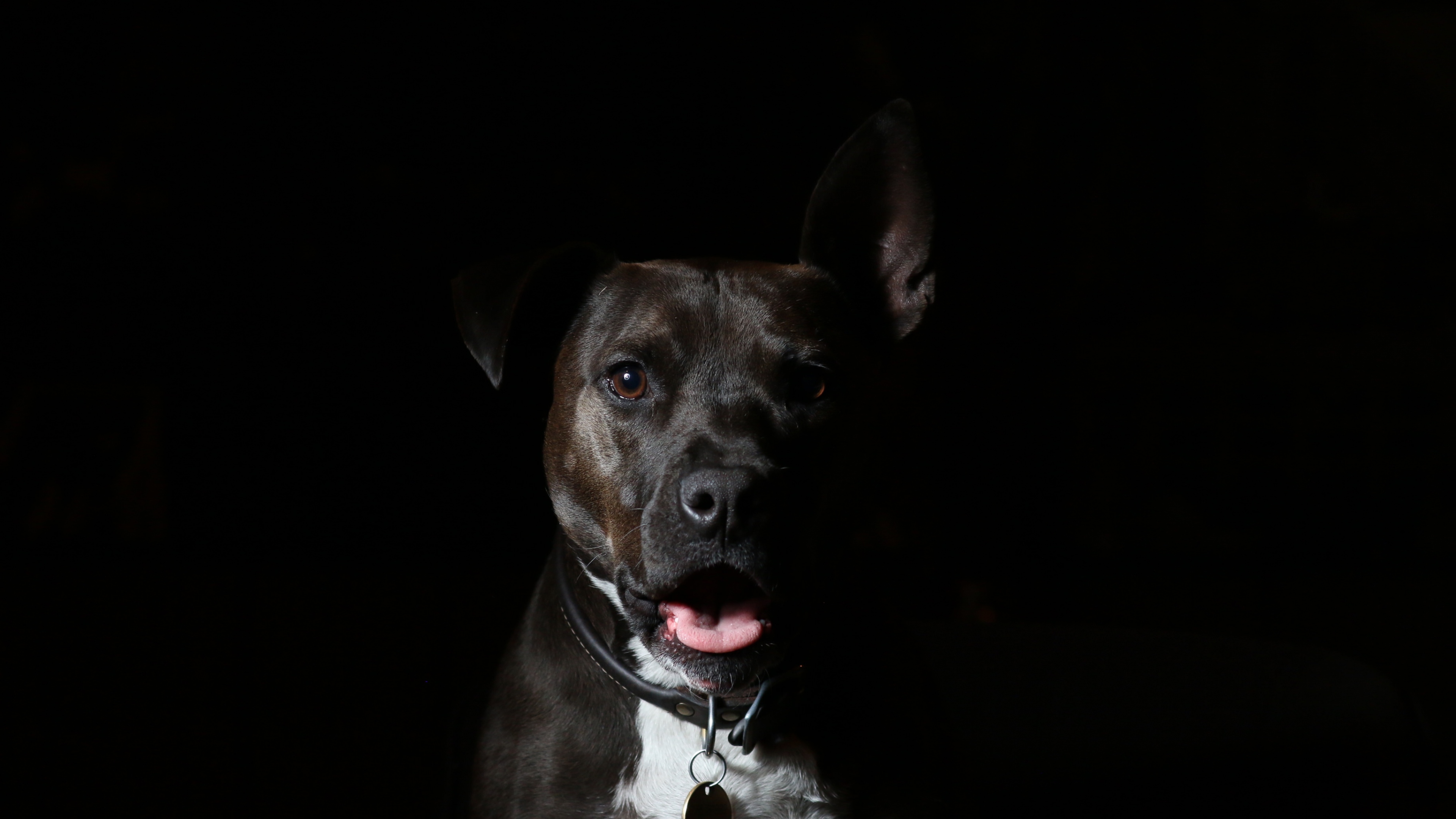 Description: A dog is standing in the dark with its tongue out and it's tongue out and it's tongue out.