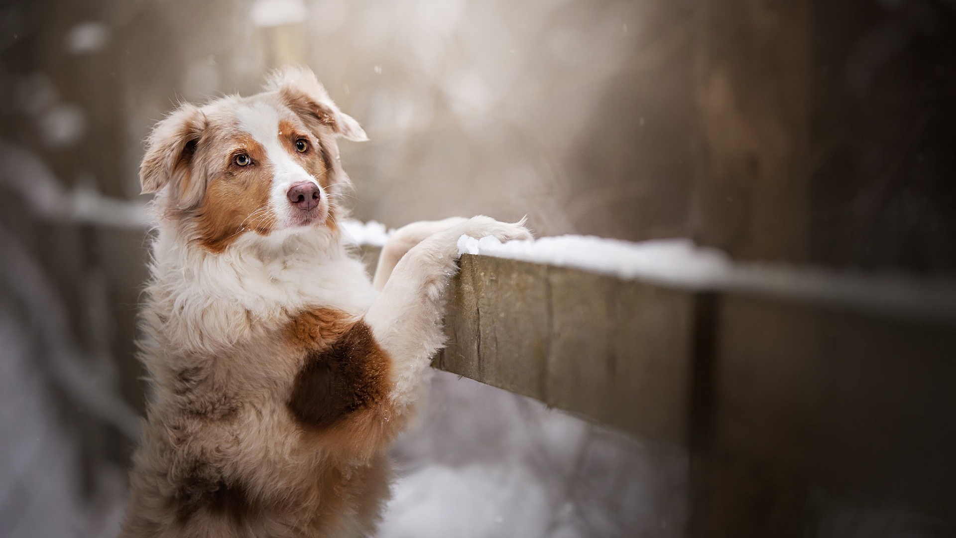 Description: A dog is standing on its hind legs and pawing on a fence post in the snow.