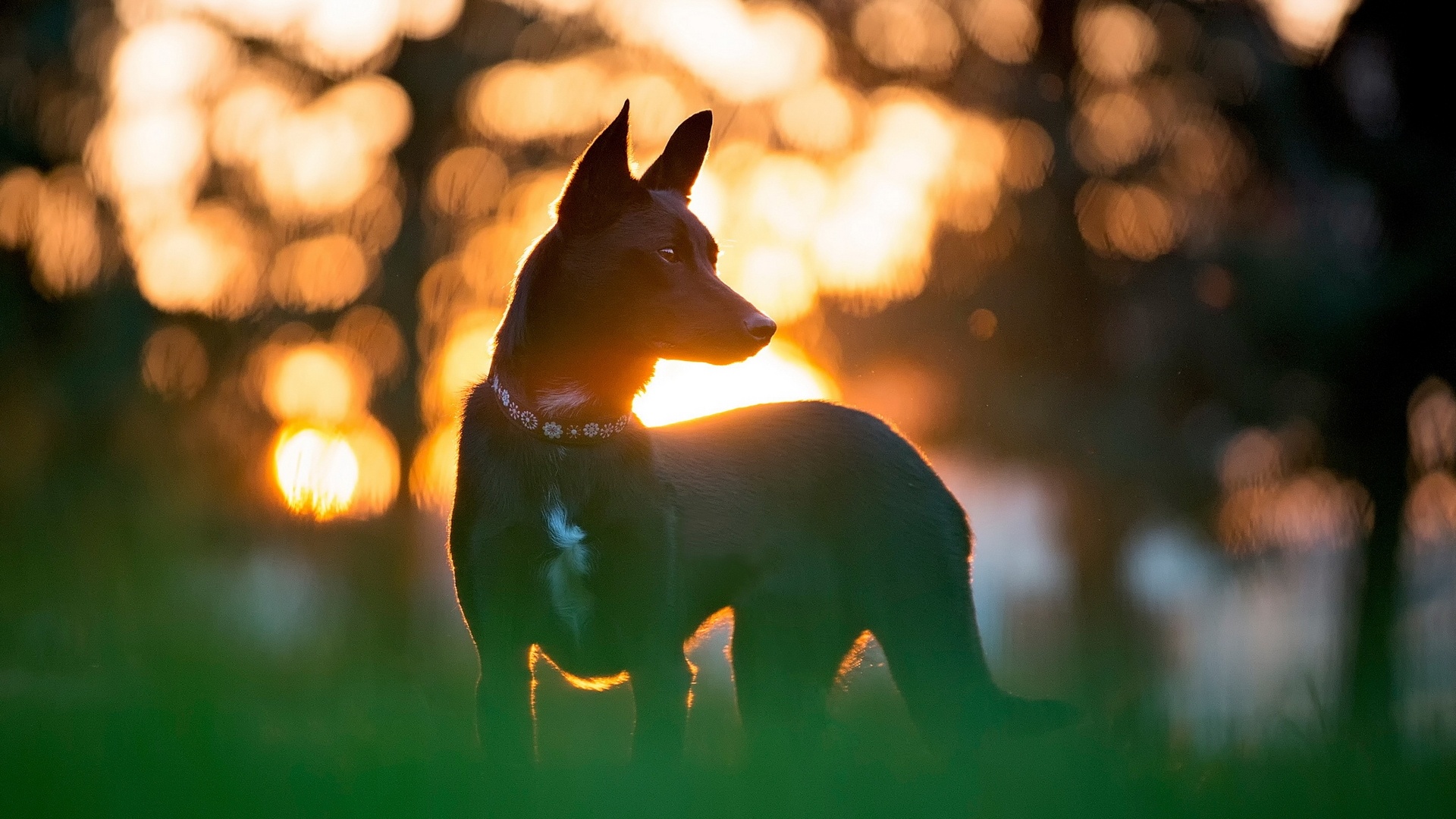 Description: A dog standing in the grass at sunset with the sun shining behind it and trees in the background.