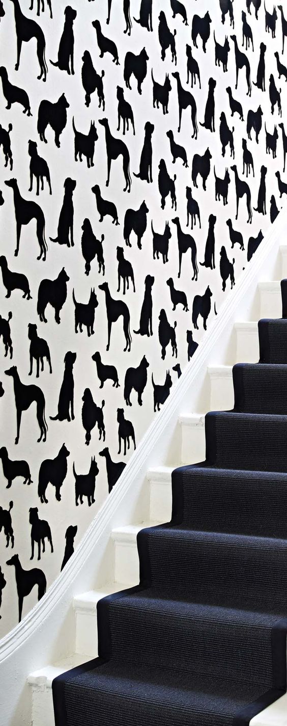 Description: A wall with a dog pattern on it and a stair case with a dog wallpaper on it and a dog wallpaper on the wall.