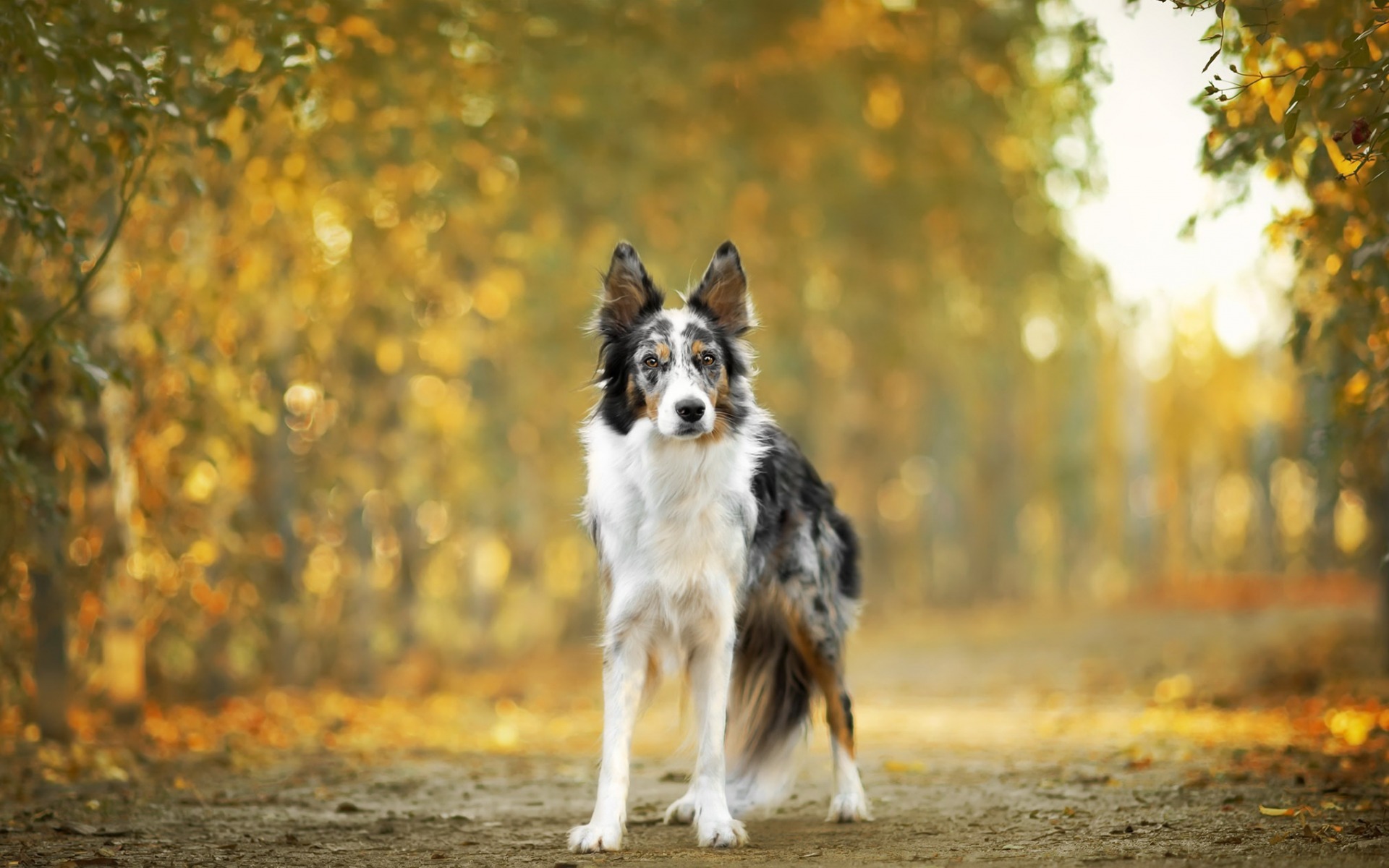 Description: A dog standing on a dirt road in the woods with trees in the background and leaves on the ground.