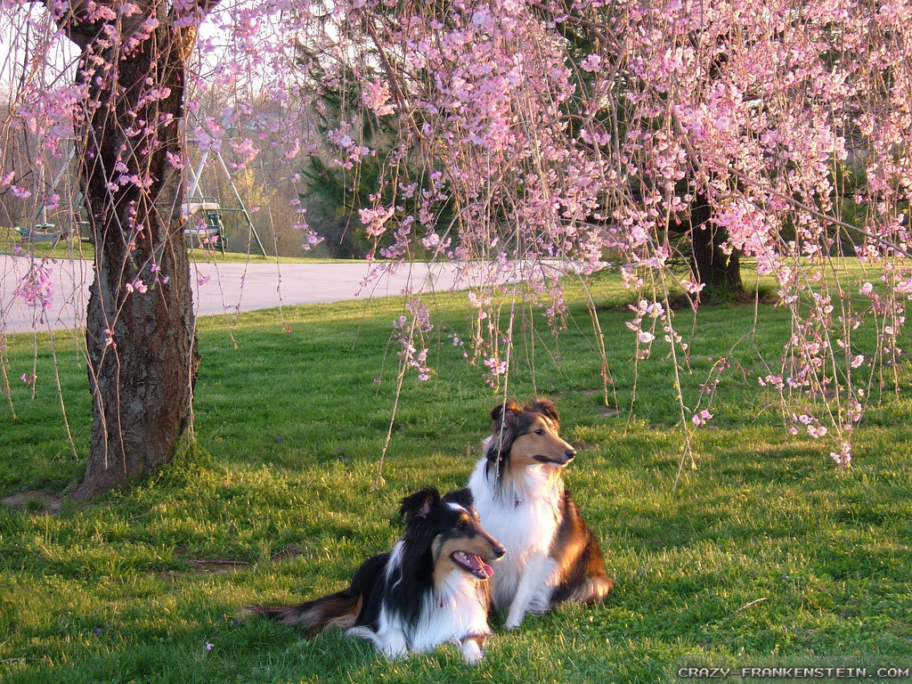 Description: Two dogs sitting in the grass under a tree with pink flowers on it's branches and a bench in the background.