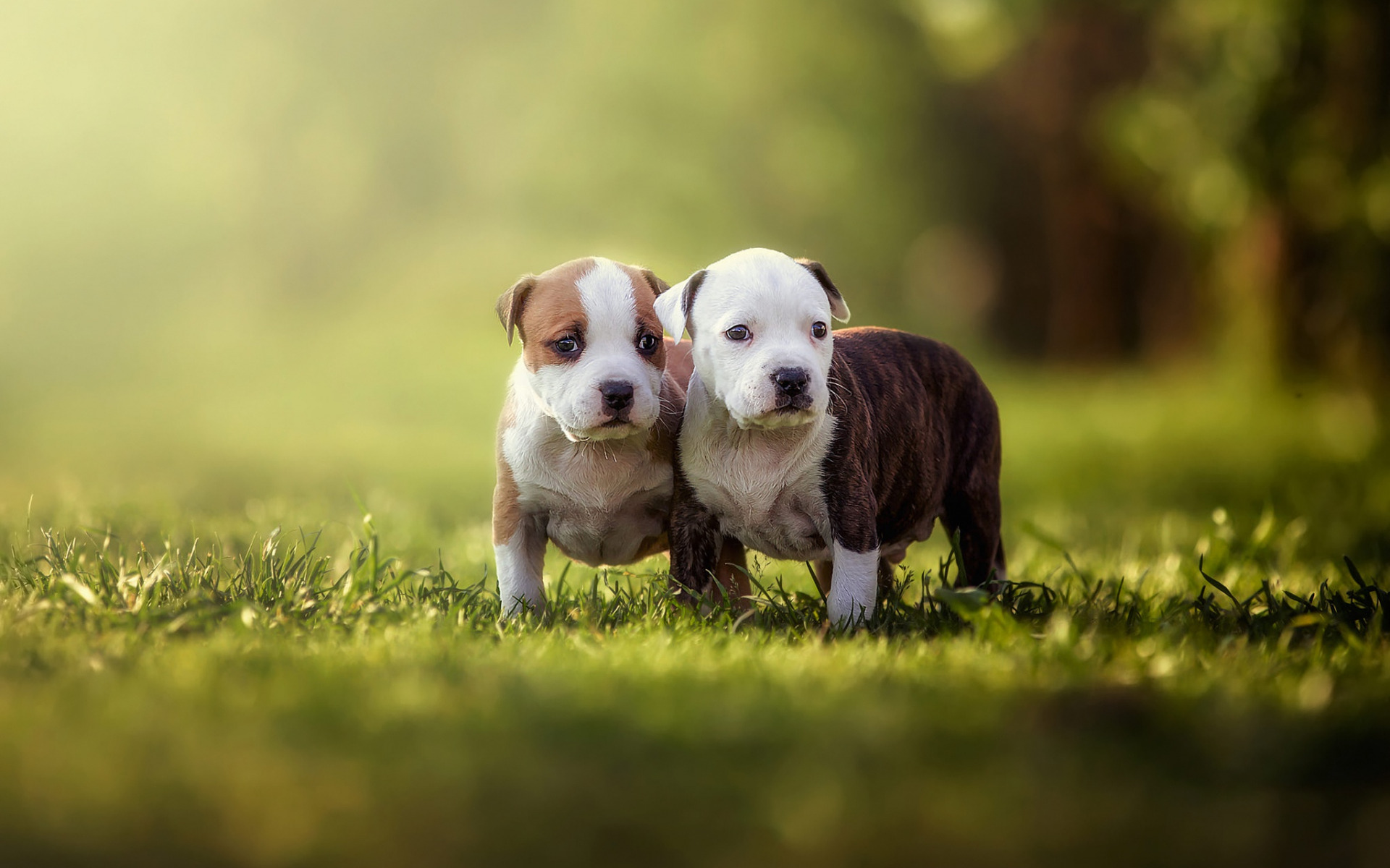 Description: Two dogs standing next to each other on a lush green field of grass with trees in the background and a soft light.