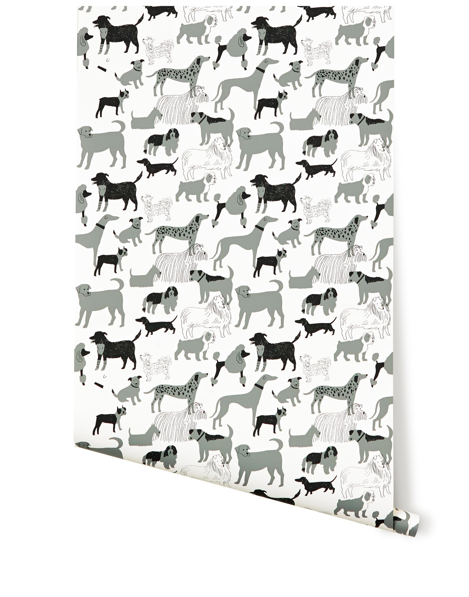 Description: A wallpaper with a pattern of dogs on it's side and a white background with black and grey dogs on it.