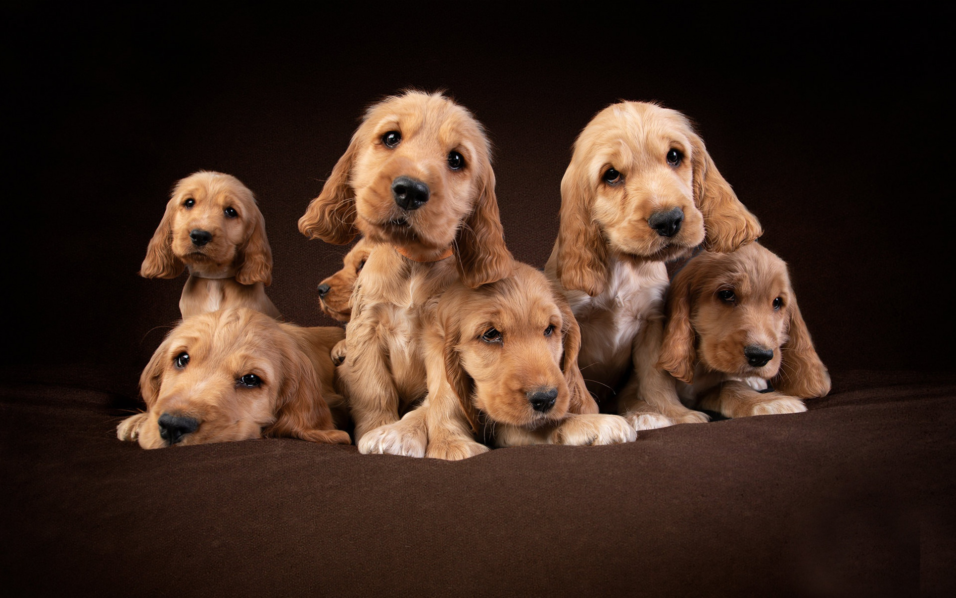 Description: A group of four dogs sitting next to each other on a brown background with a black background behind them.