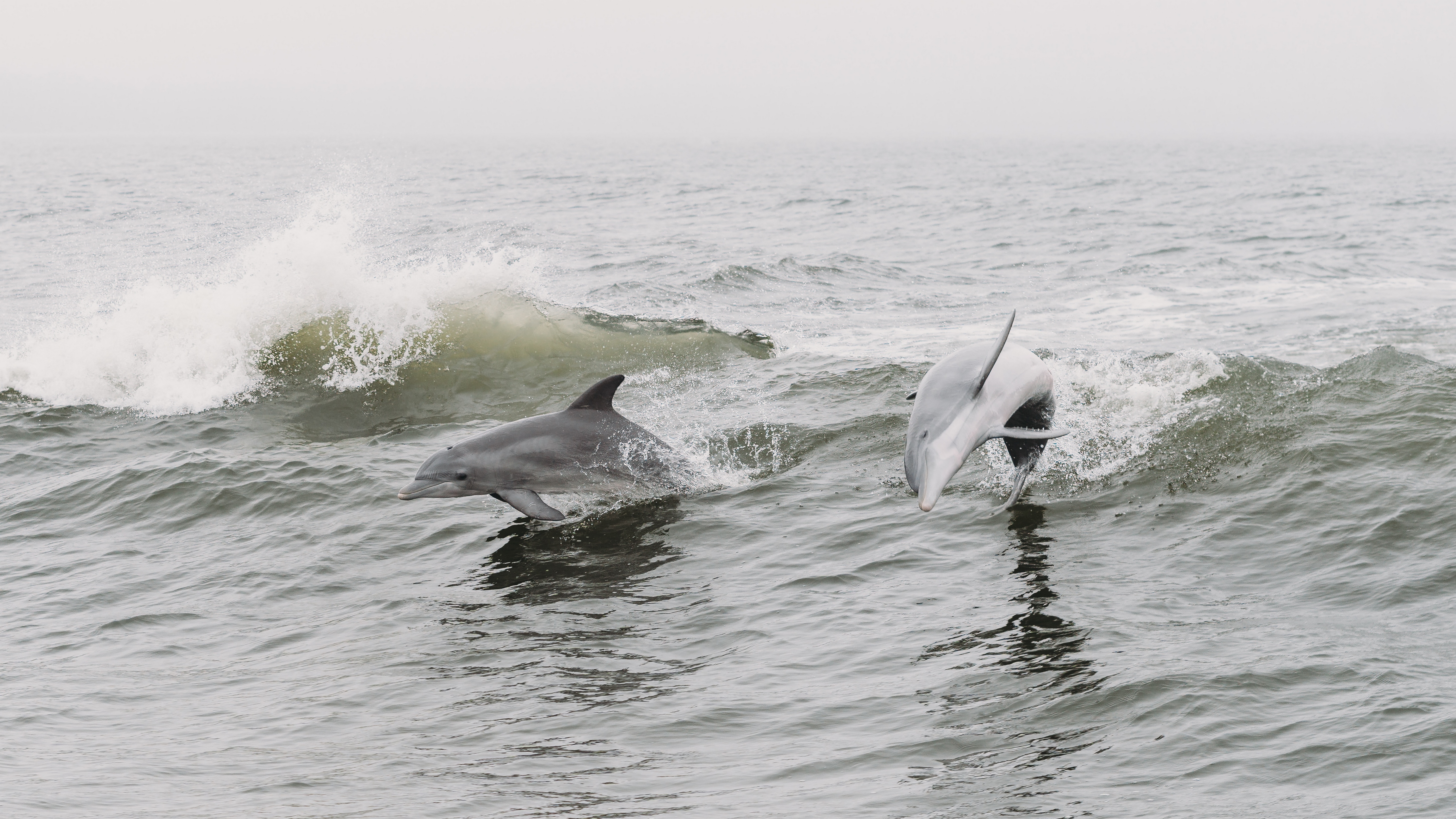 Description: Two dolphins swimming in the ocean with a wave coming in to them and one is holding a surfboard.