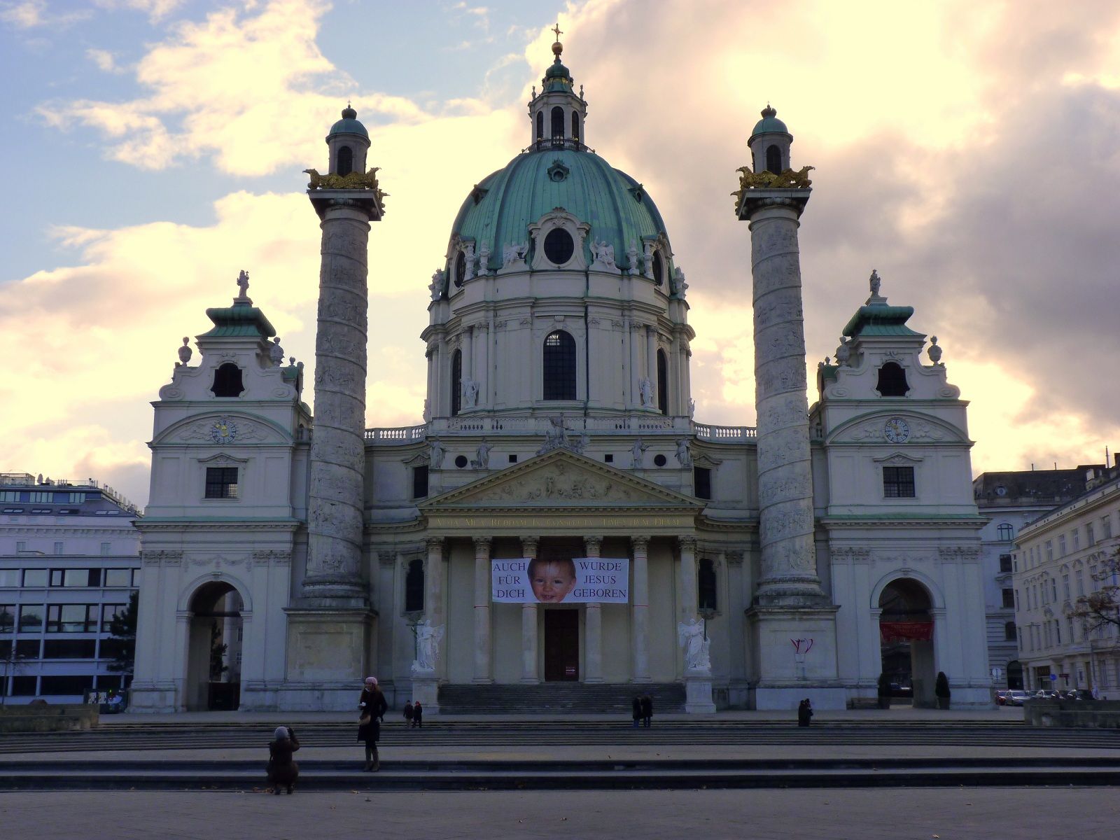 Description: A large building with a dome and two towers on top of it's sides and a sky background.