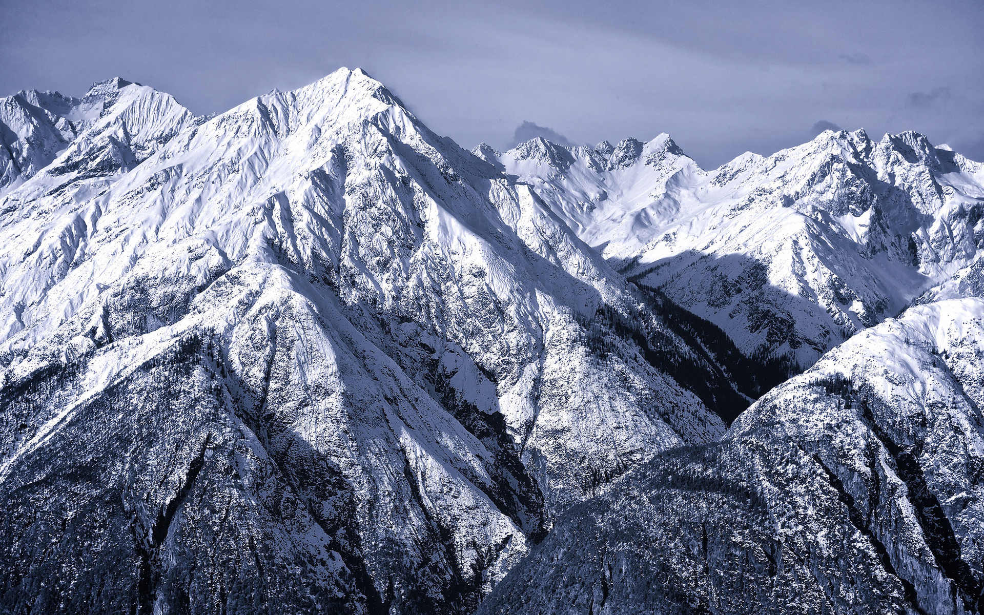 Description: A mountain range covered in snow under a cloudy sky with a blue sky in the background and a few clouds in the sky.
