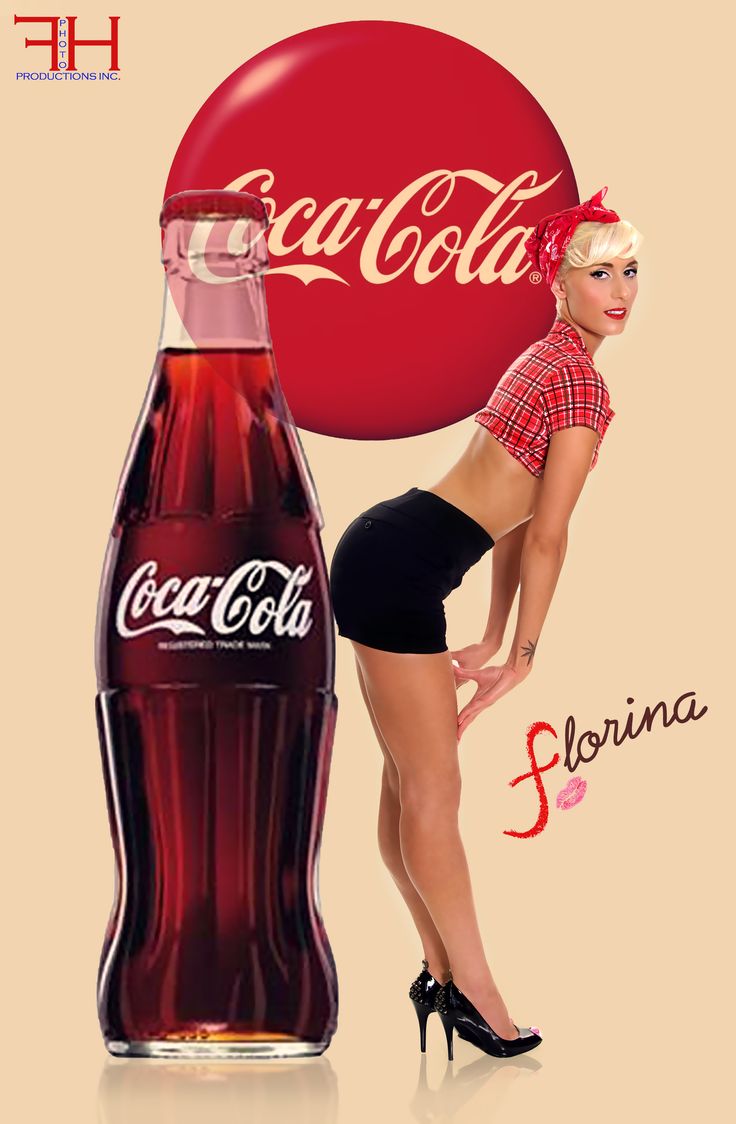 Description: A woman in a short skirt and a coca cola bottle with a woman in a short skirt standing next to it.