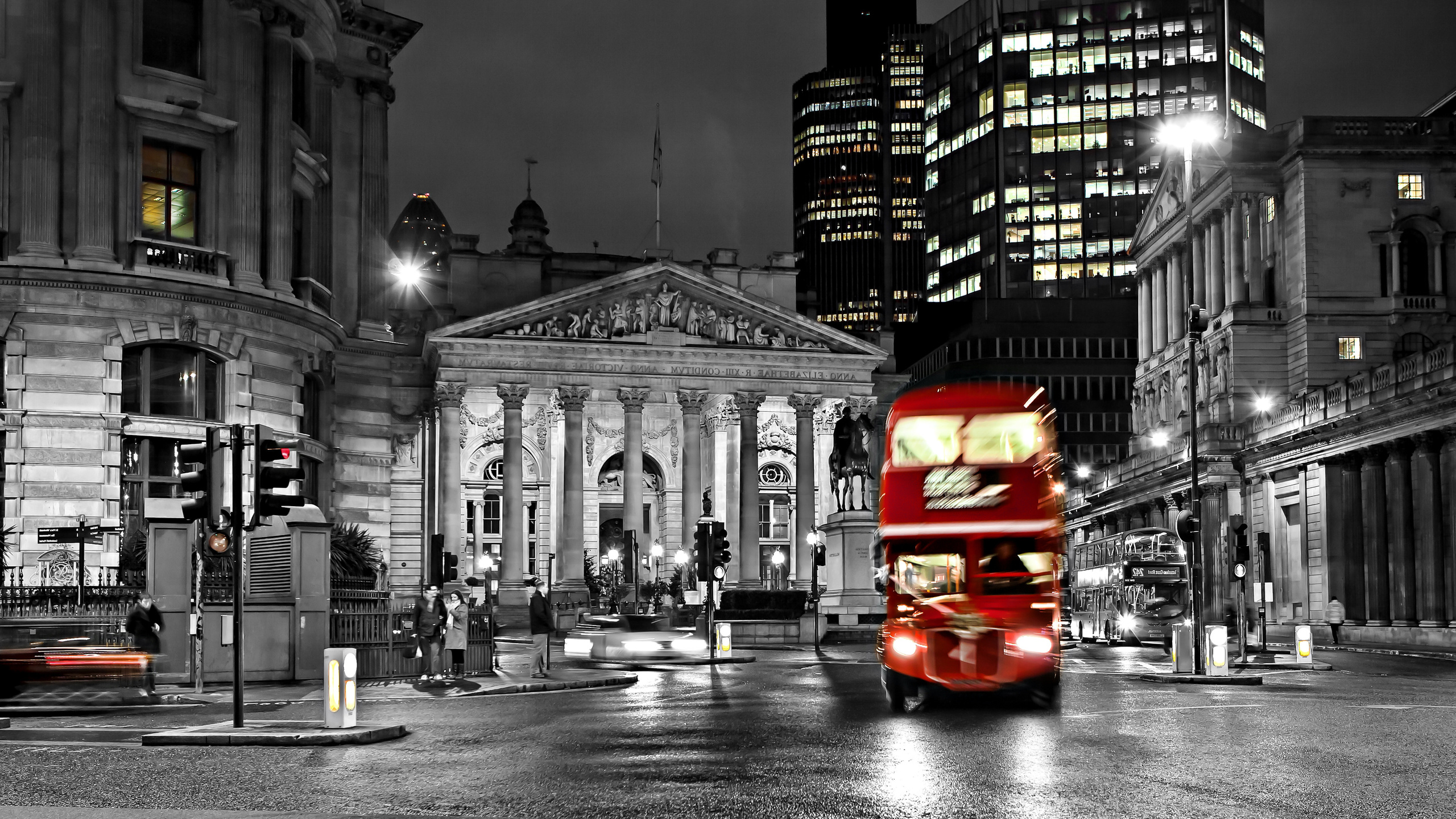Description: A double decker bus driving down a street in a city at night time with tall buildings in the background.