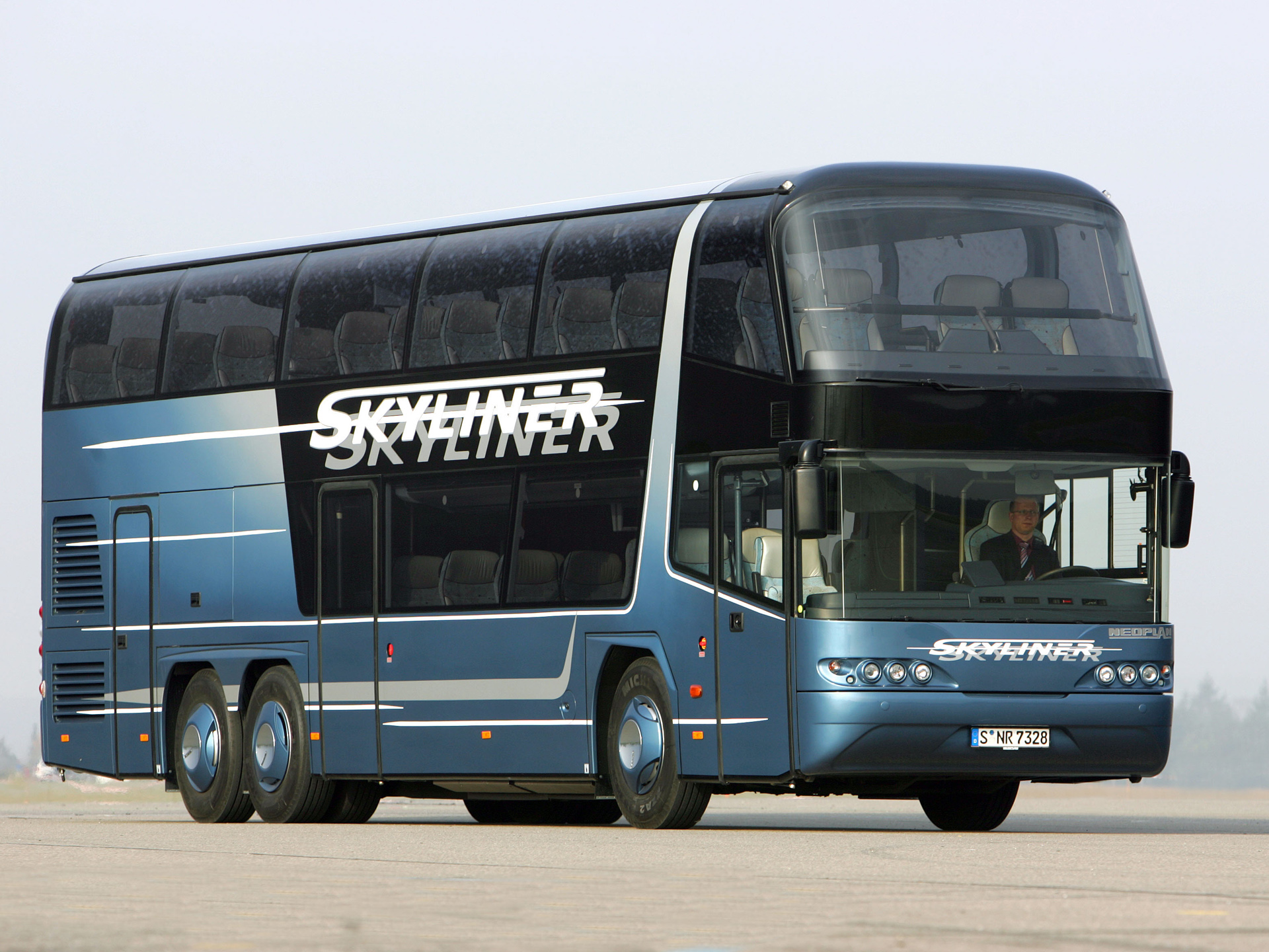 Description: A double decker bus is parked on the street in front of a building with a sky background and a person standing in the doorway.