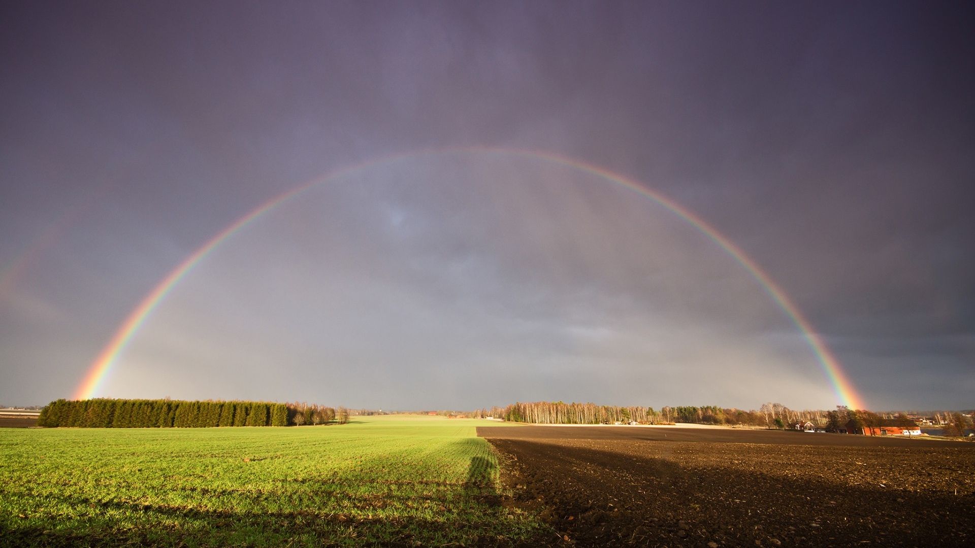 Description: A double rainbow is seen over a field of crops and a farm in the distance with a dark sky.