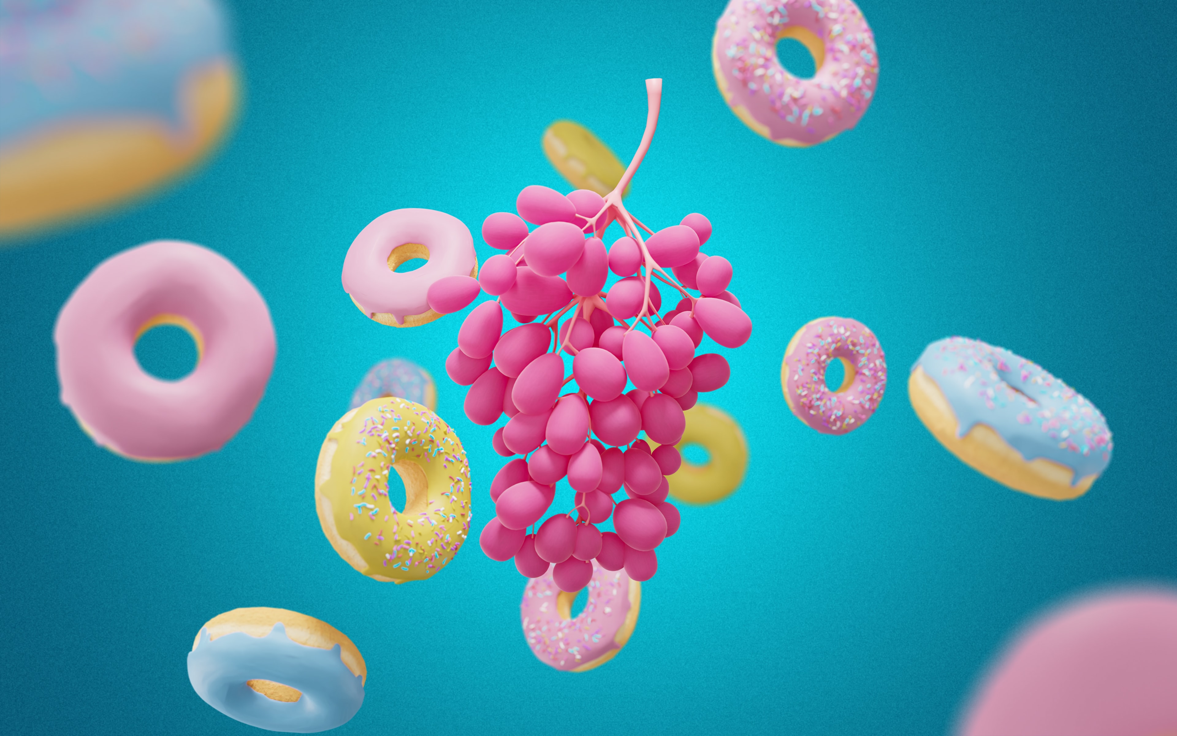 Description: A bunch of doughnuts and donuts flying in the air with a bunch of them on a string.