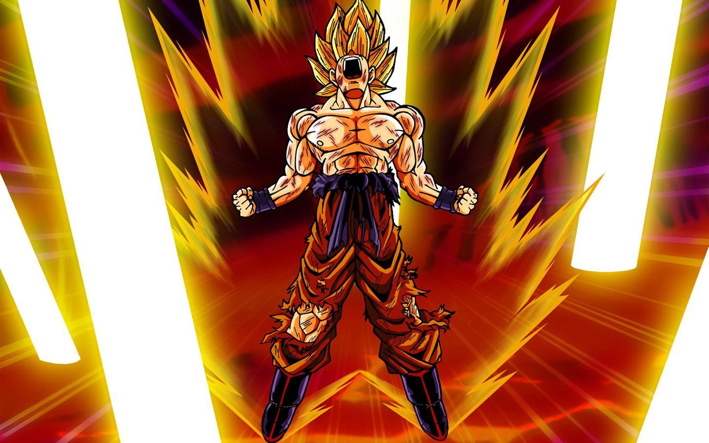 Description: A dragon ball character is standing in front of a background of flames and beams of light and colors.