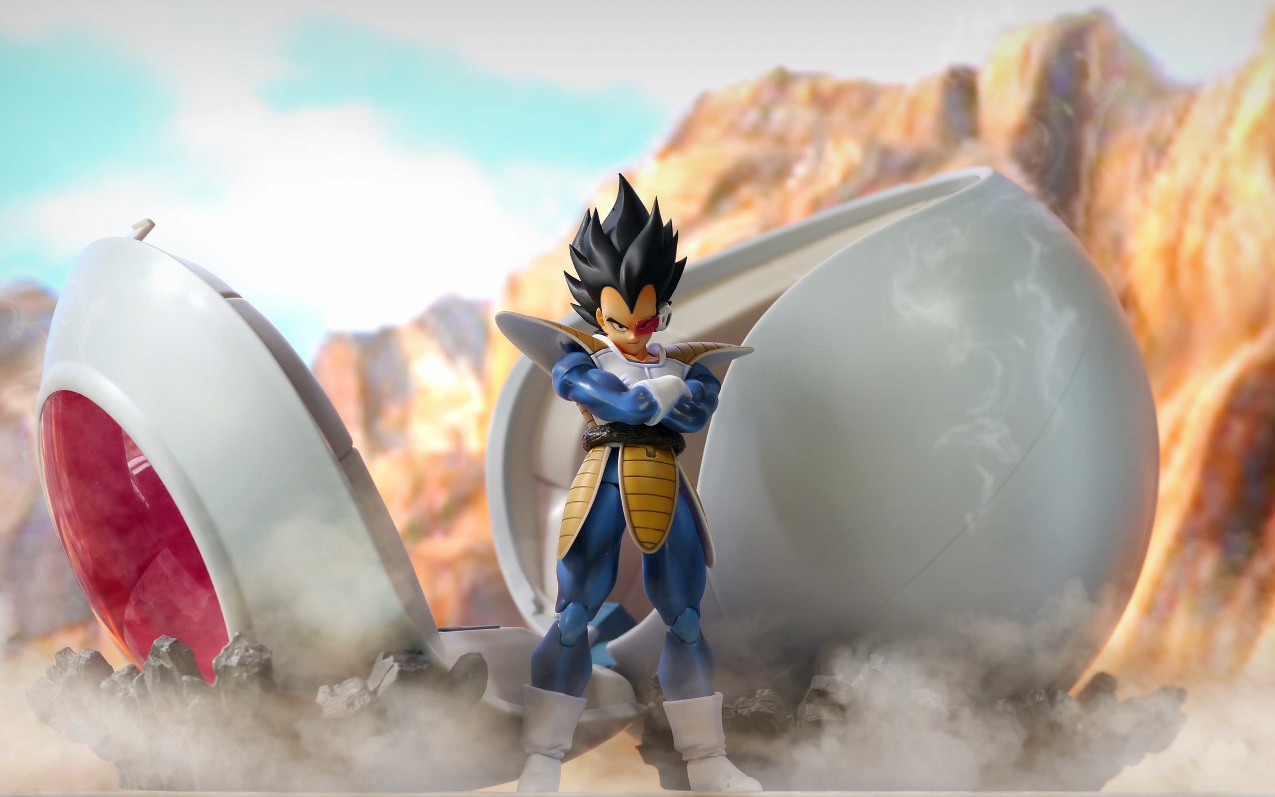 Description: A dragon figurine standing in front of a giant egg in a desert setting with mountains in the background.