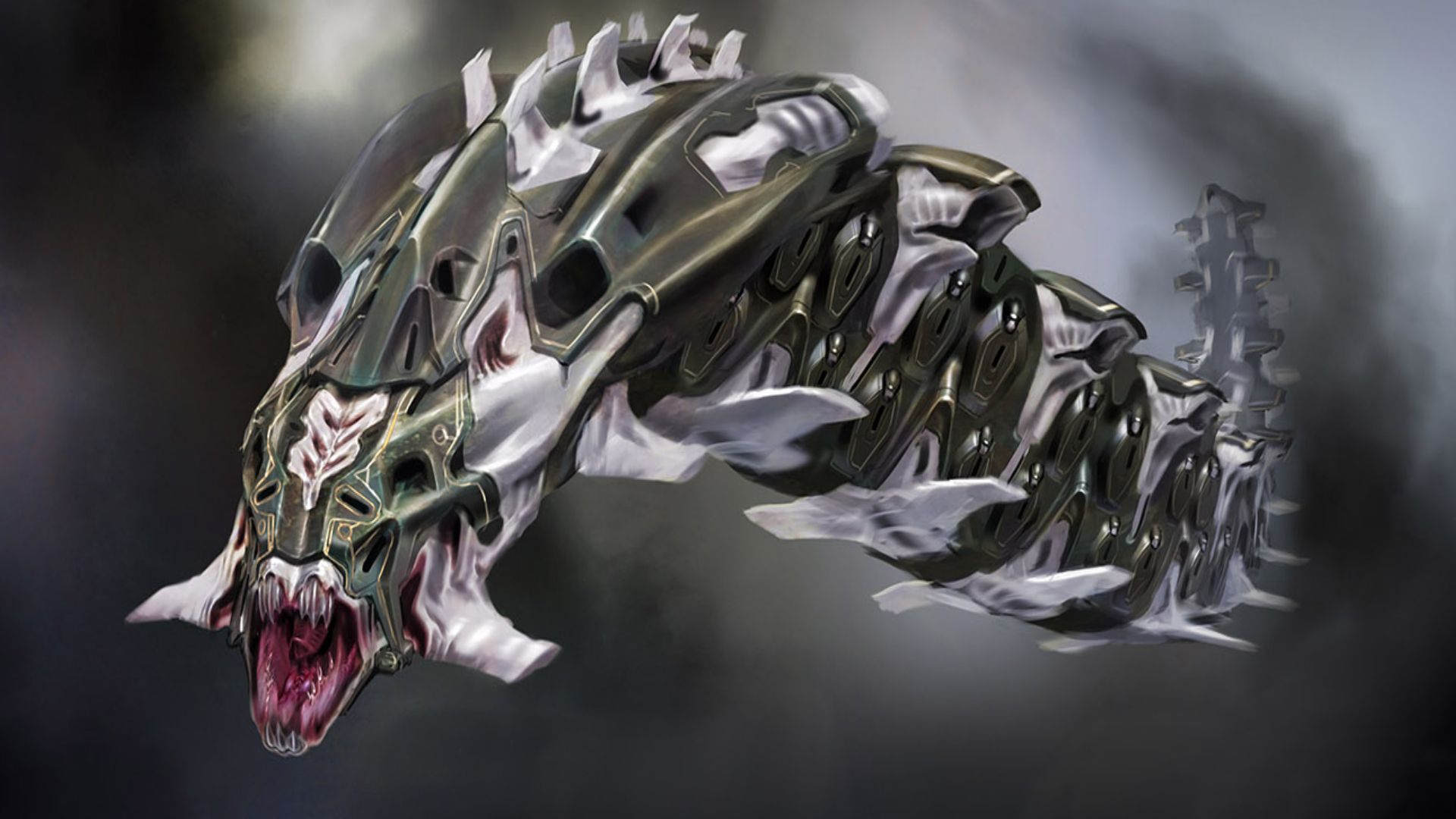 Description: A dragon like creature with a large mouth and sharp teeth is flying through the air with a cloudy background.
