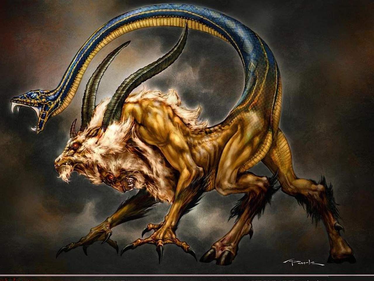 Description: A painting of a dragon with a long tail and large horns on it's back legs.
